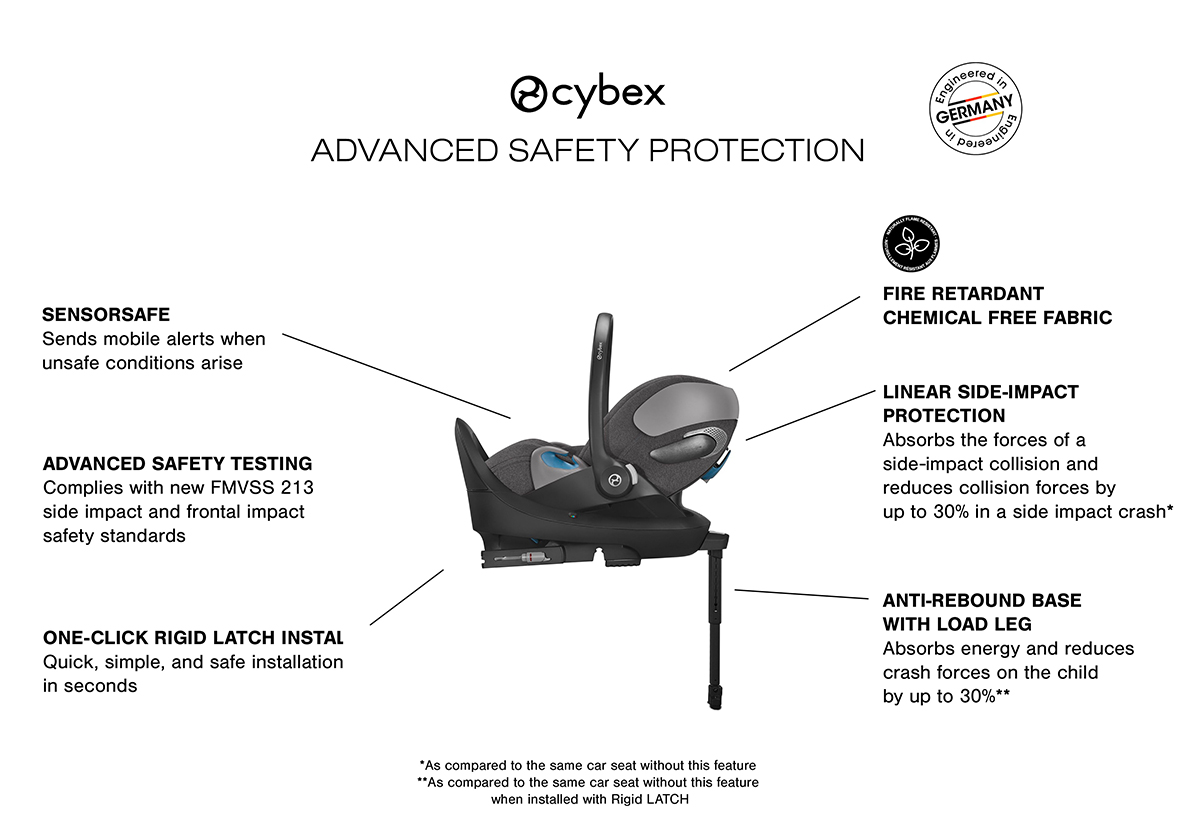 Safety. Comfort. Luxury. The CYBEX Platinum Cloud T Comfort Extend Infant Car Seat is meticulously crafted to meet our elevated standards of safety, comfort, and luxury. Rigorously tested to adhere to German ADAC testing protocols, your child's safety is our paramount concern. The Cloud T is outfitted with cutting-edge safety features, including the SensorSafe Smart Technology chest clip, Load Leg, Linear Side-Impact Protection, and Anti-Rebound Base. Wrapped in elevated fabrics and featuring premium design elements, the Cloud T epitomizes luxury and comfort for your child. Its near-flat recline and extended leg rest when used outside the vehicle ensure optimal ergonomics. Enhanced ventilation and breathable fabrics further elevate your infant's ride, ensuring maximum comfort. Features ADVANCED SAFETY PROTECTION; SENSORSAFE SMART TECHNOLOGY: Bluetooth enabled chest clip sends mobile app alerts if a child unbuckles the chest clip, if the back seat becomes too warm or too cold, and if the driver unintentionally leaves the child behind.; SAFETY TESTING: complies with new FMVSS 213 side impact and frontal impact safety standards.; LOAD LEG BASE: Absorbs energy and reduces crash forces on the child by up to 30%**; ANTI-REBOUND BASE: Reduces forces on the child by up to 30% in a rear or front impact crash**; LINEAR SIDE-IMPACT PROTECTION: Absorbs the forces of a side-impact collision and reduces collision forces by up to 30% in a side impact crash*; EUROPEAN BELT PATH: Adds stability and helps limit rotation in a frontal crash when the car seat is installed without a base; ENERGY-ABSORBING SHELL: Provides improved side-impact protection and helps reduce the forces on the child in a crash; ONE-CLICK RIGID LATCH INSTALL: Quick, simple, and safe installation.; FIRE RETARDANT CHEMICAL FREE FABRIC: Passes federal safety standards without the use of added fire retardant chemicals ; COMFORT FEATURES; COMFORT MODE: 45% more recline* for a comfortable and ergonomic position when used outside the vehicle; IN-SHELL AIR VENTILATION: Provides natural airflow to keep your child comfortable; 12-POSITION ADJUSTABLE HEADREST: Harness adjusts with the headrest for a proper fit as your child grows; XXL UPF50+ SUN CANOPY: Includes mesh for air ventilation***; REMOVABLE INFANT INSERT: Ensures proper fit and support for babies from 4-11 lbs.; EASY-IN BUCKLE PAD: Keeps the harness buckle in a forward position for easy loading and harnessing; STROLLER COMPATIBILITY: Connects with all CYBEX strollers to create a convenient travel system using car seat adapters; EASY TO CLEAN: Machine washable seat fabrics; FAA COMPLIANT: For aircraft use without the base; *As compared to the same car seat without this feature; **As compared to the same car seat without this feature when installed with Rigid LATCH; ***Mesh is not UPF50+; Specifications Usage: 4-30 lbs;.