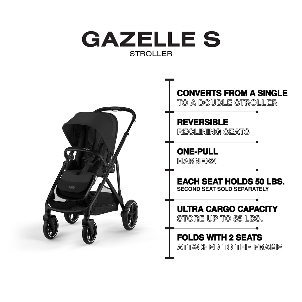The CYBEX Gazelle is the ideal first stroller that includes a removable shopping basket with an impressive additional carrying capacity of 25 lbs. Adapting to the changing needs of your family, the Gazelle can easily convert from a single to a double stroller without additional adapters. Designed to support 20+ different configurations, the Gazelle includes a near-flat reclining reversible seat and is compatible with our Gazelle Cot and all CYBEX Infant car seats for use from birth. Add the optional kid board (sold separately) to accommodate 3 children. Endless opportunities for your growing family! As your family grows, convert the Gazelle from a single to a double stroller with the included second full size seat to allow two children to ride at the same time. Each Gazelle seat can be used in parent-facing or forward-facing mode and can be attached on either the stroller's upper or lower positions. Easily converts from a single to double stroller without additional adapters, second seat unit is included! ; Can fold with two seat units attached to the frame; Unique one-pull, one-hand harness helps secure your child in seconds; Independent reclining seat back & leg adjustments offer multiple configurations, allowing you to position your child for comfort; Removable Shopping Basket provides extra storage up to 25 lbs.; Stroller Features Easily converts from a single to double stroller without additional adapters; Folds with two seat units attached to the frame; One-Pull Harness: Our user-friendly harness system makes securing your child in the seat a breeze with one simple pull no fuss and extra handy if you're doing it twice.; Independent reclining seat back and leg adjustments offer multiple configurations, allowing you to position your child for comfort; Supports 20+ configurations using Gazelle Seat units, Gazelle Cots, CYBEX infant car seats or the removable Shopping Basket; Removable Shopping Basket provides extra storage up to 25 lbs.; Extra-large, easy access lower basket for extra storage space while out on the go (30 lbs. max load); Premium design with a robust all-aluminum frame, leatherette handlebar and bumper bar, and high-quality fabrics; All-wheel suspension with integrated frame shock absorption system provides a smooth ride over a variety of surfaces; Streamlined fold for easy storage at home or in the car; Extendable XXL sun canopy with mesh window and a UPF 50+ rating; Large, reversible seat unit reclines to a near-flat position; 50 lbs. weight capacity for each seat unit (second seat unit sold separately); One-hand, height-adjustable handlebar offers comfortable steering for all users; Versatile 3-in-1 Travel System with the seat unit, Gazelle Cot (sold separately), and any CYBEX infant car seat (sold separately) using the included adapters; Stroller compatible with CYBEX, Maxi-Cosi Mico 30 and Nuna PIPA infant car seats using the included adapters; What's in the Box The Cybex Gazelle 2 Double Stroller includes: Stroller frame; 2 x seat units with bumper bar; Shopping basket; Rain cover; Cup holder; Car seat adapters; Specifications Stroller Dimensions: 41.9" L x 25.4" W x 42.7" H; Folded Dimensions: 32.9" L x 25.4" W x 12.2" H (with wheels); Stroller Weight: 28.4 lbs; Stroller Usage:From 6 months to 50 lbs. per seat;.