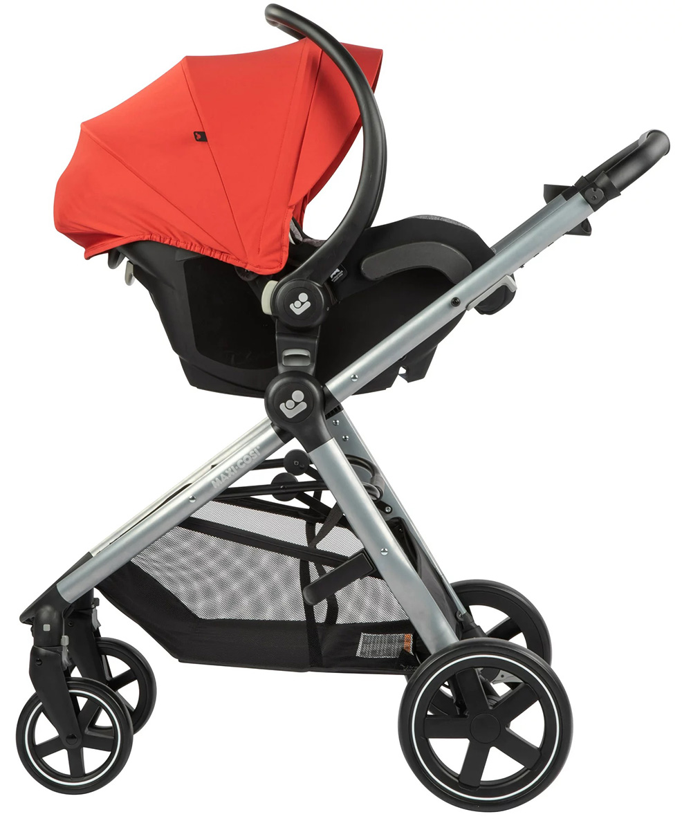 Feel free to go wherever you want, whenever you want with the Zelia² Travel System. The Zelia² stroller is lightweight and stylish, and its 5 modes of use deliver the utmost in comfort. Baby will rest soundly as the carriage mode fully reclines. As baby grows, carriage mode switches easily to a toddler seat. Both the carriage and stroller seat modes are parent- or world facing. The stroller's recline adjuster is now located at the top of the seat with a lift lever to easily adjust the seat angle. To close the seat press a button, lift and fold. Then there's the narrower frame that allows for enhanced mobility, all while creating a larger seat for more space as your child grows. The expanding canopy and flip-out visor protect baby from sunlight, and the peek-a-boo window lets you stay connected. There's plenty of storage for personal items and accessories in the spacious basket. The moveable handle raises or lowers to the best height. Once you and baby have finished your stroll, it folds effortlessly and stands upright. Zelia 2 Features: Choose between forward- or rear facing in carriage mode; In stroller mode, the seat is designed to recline for comfort in both directions; Large canopy has a flip-out visor and peek-a-boo window; Customize the handle to your preferred height for a more comfortable stroll; Extra inlay for added comfort and support; machine washable for quick cleaning; Self-standing fold for easy storage; Extra-large storage basket fits larger items with easy access; Smooth maneuvering wheels with all-wheel suspension technology; Convenient parent cup holder; Bumper bar swings to the side to easily get in and out of the seat; Meets Disney size requirements; Mico 30 Infant Car Seat Baby will enjoy riding in the Mico 30 infant car seat, featuring superior comfort and safety from 5 to 30 pounds. It's one of the lightest infant car seats, and easy for parents to carry with a contoured handle. The Cozi-Dozi head insert provides extra support for infants. Its expandable canopy with flip-out visor offers maximum UV protection. The seat pad removes easily and goes in the washer and dryer for a quick clean. It also includes an adjustable base with LATCH for a better fit in your car. To protect your child in a way that's both pure and cozy, the Mico 30 features PureCosi fabrics made without wool or added fire retardant treatment that are machine washable and dryer safe. Your little one will ride comfortably, taking in the sights while you enjoy the everyday luxuries the Zelia² Travel System provides. Mico 30 Features: Rear-facing from 5-30 pounds and up to 32"; Featuring PureCosi fabrics made without wool or added fire retardant treatment that are machine washable & dryer safe; Includes a convenient stay-in-car adjustable base; Easily removable fabrics for cleaning; innovative design allows for removal without rethreading harness; Easy to clean: machine washable and dryer safe fabric; Flip-out visor on canopy for extra protection when needed; Includes Cozi-Dozi infant support for smaller babies; Contoured handle curves around your hip for a more comfortable carry; One click LATCH system, with easy click-in for better installation; Installs easily without the base, making it perfect for city trips in a cab; Specifications Stroller dimensions: Open: 40" L x 24.25" W x 44" H; Fold: 24" W x 22" W x 46" H; ; Capacity: Birth to 50 lbs; Stroller weight: 22.2 lbs; Car seat dimensions: 28.75" x 17.38" x 24.75"; Usage weight/height: 5-30 lbs / Up to 32"; Car seat weight: 8.7 lbs (Base weight: 9.9 lbs);.