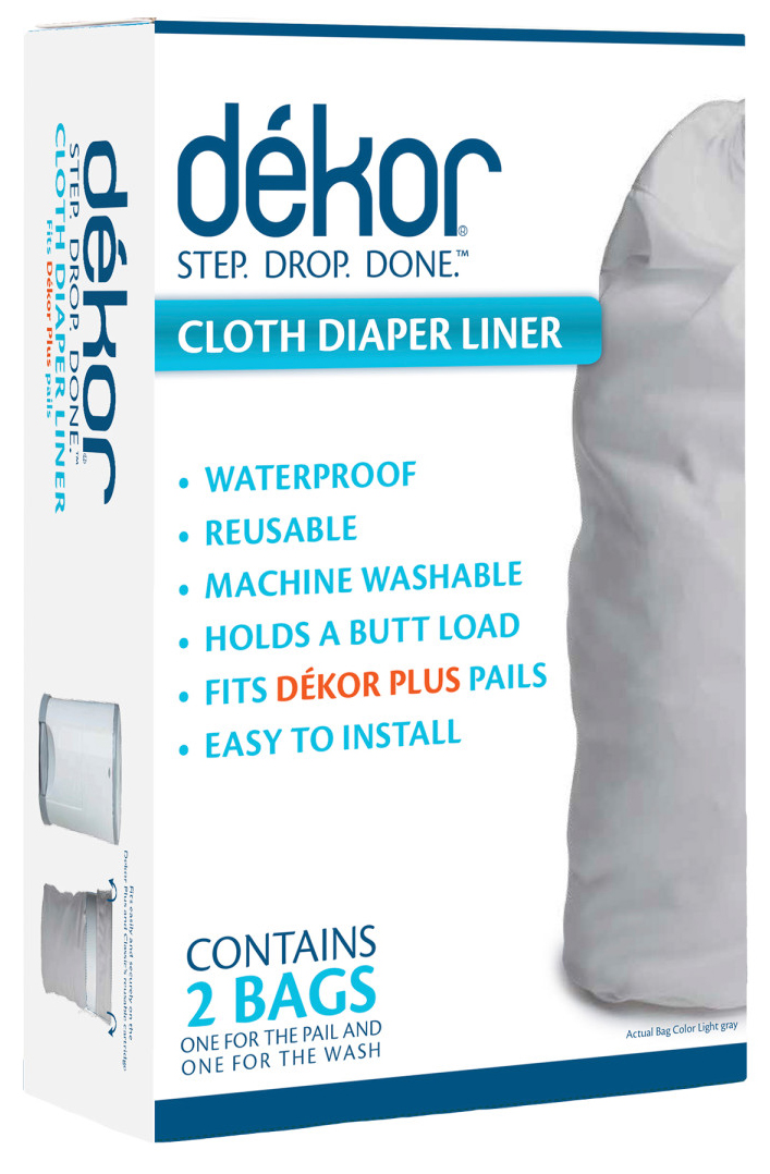 Now you can enjoy the simplicity of the Dekor Plus Step and Drop functionality when using cloth diapers with the Dekor Cloth Diaper Liner. Waterproof?Special coating prevents leaking and wicking through of wet diapers; Reusable?can be used over and over again just like your cloth diapers. Brilliant!; Machine Washable?High quality fabric can be laundered right along with the diapers; Holds a Butt Load?Holds a bunch of cloth diapers just like regular refills; Drawstring Closure?helps when heading to the laundry; One Box, Two Bags?one in the pail, and another in the wash; Custom Design?folds over and hangs securely from the Dekor Plus? reusable cartridge; Eco- Friendly?You are among the greenest by using cloth diapers, this makes it official; The Cloth Diaper Liner is only designed to fit the Dekor Plus sized pail at this time. The liner is available in Cool Gray.