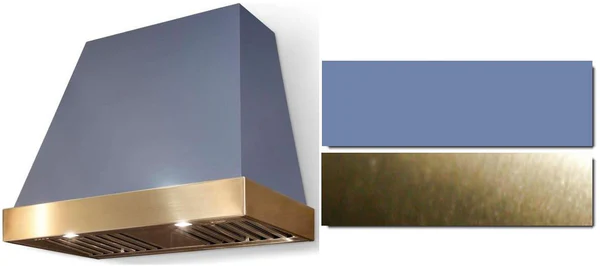 Trapezoid Wall Mount Range Hood with 3-Speed/600 CFM, LED Lighting, Baffle Filters, and Electronic Touch Controls: Carnaby Blue, Antique Brass Trim. Large 3-speed blower operates at lower RPM reducing the sound level. Bright LED lighting offers a natural-looking, 3000K color spectrum. The hood features 2 lights. Electronic touch controls for 3-speed blower and LED lights. Dishwasher-safe, commercial-style baffle filters for effectively removing airborne contaminants. Detergent inlet holes and grease exit holes in baffle filters for superior dishwasher cleaning. Mounting bars at the top and bottom allow for attaching to stud supports. Open top and back design for centered duct location or offset top duct and/or rear offset discharge. LED light bulbs draw only 6 watts each and energy efficient motors draw only 2.5 amps. Series: Euclid. Color: Carnaby Blue, Antique Brass Trim. Hood Style: Trapezoid. Mounting Type: Wall Mount. Number of Speeds: 3. Venting Type: Ducted. Blower Included: Yes. Blower Type: Internal. Hood Width x Depth x Height: W x 24" D x 30" H (600 cfm/8" collar). Duct Cover Options: 12", 24" and 48" Tall. 48"(30"H): 98 lbs. Volts: 120V. 600 CFM models draw approx: 2.7 Amps. Hood Sone Level: Ranges from 5-7.