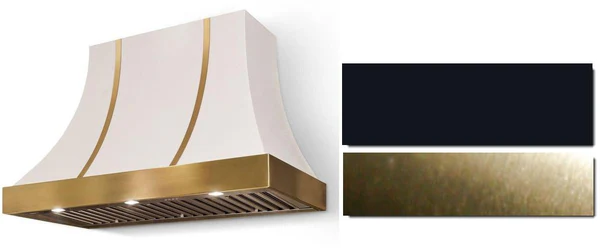 Concave Wall Mount Hood with 3-Speed/1200 CFM, LED Lighting, Baffle Filters, and Electronic Touch Controls: Gloss Black with Antique Brass Trim. Large 3-speed blower operates at lower RPM reducing the sound level. Bright LED lighting offers a natural-looking, 3000K color spectrum. The hood features 3 lights. Electronic touch controls for 3-speed blower and LED lights. Dishwasher-safe, commercial-style baffle filters for effectively removing airborne contaminants. Detergent inlet holes and grease exit holes in baffle filters for superior dishwasher cleaning. Mounting bars at the top and bottom allow for attaching to stud supports. Open top and back design for centered duct location or offset top duct and/or rear offset discharge. LED light bulbs draw only 6 watts each and energy efficient motors draw only 2.5 amps. Series: Cascade. Color: Gloss Black with Antique Brass Trim. Hood Style: Concave. Hood Width x Depth x Height: W x 24" D x 30" H (1200 cfm/10" collar). Duct Cover Options: 12", 24" and Tall. 48"(30"H): 124 lbs. 1200 CFM models draw approx: 5.4 Amps. Hood Sone Level: Ranges from 5-7.