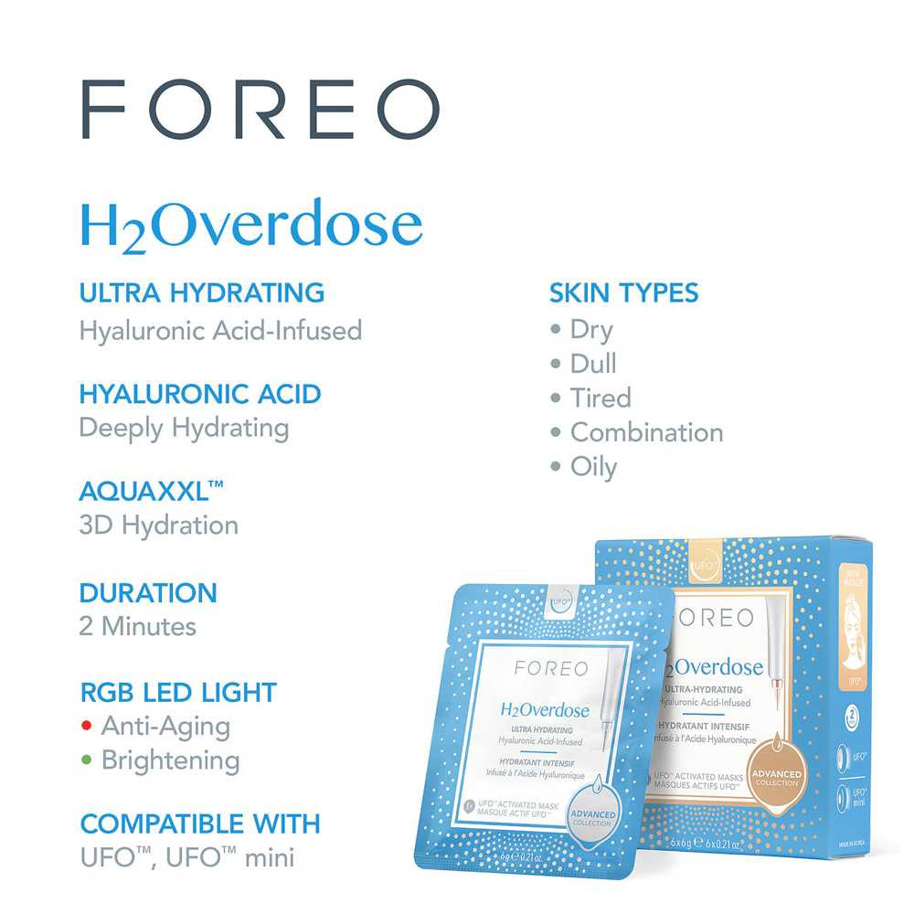 Inspired by Korean skincare Foreo H2Overdose Mask works with your UFO 2 and UFO mini 2 to instantly quench dehydrated skin bathing it in soothing moisture. Just 2 minutes is all it takes to instantly infuse skin with moisture for a smoother and more supple appearance. This highly-concentrated formula harnesses the power of moisture-binding hyaluronic acid and ceramide 3 to replenish skins natural moisture barrier. The result is ultra-hydrated skin that looks spectacular! Benefits: Made for use with UFO 2 and UFO mini 2 Infused with hyaluronic acid and ceramide 3 Instantly and intensively hydrates even the driest skin Leaves skin smoother and more supple Only takes 2 minutes to do [ 6 x UFO Activated Masks / 6 x 6g ] *Compatible with the Foreo UFO 2 and the Foreo UFO Mini 2.