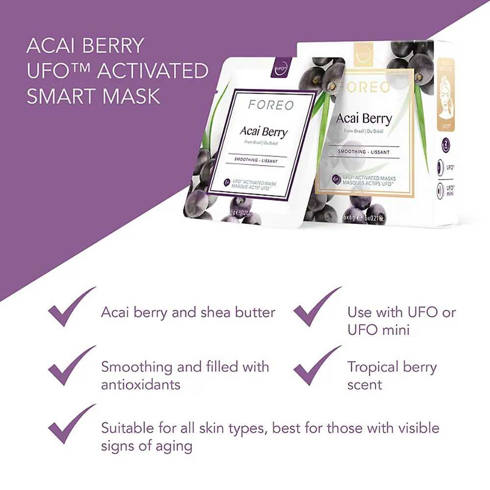 Grab your Foreo UFO 2 or UFO Mini 2 and pair it with Acai Berry Activated Masks. Youll instantly restore the youth and vitality thats been seeping from your complexion with this antioxidant-rich 6-pack of masks. Smooth skin with intense hydration that plumps it up and makes it look younger in less time than it takes to make a cup of tea. Dull and fatigued skin gives way to youthful radiance and youll have plumper and firmer skin smiling back at you in the mirror fast! Benefits: Smooths away fine lines and wrinkles Hydrates plumps and firms Restores radiance Leaves skin looking healthy and glowing [ 6x UFO Activated Masks ] *Compatible with the Foreo UFO 2 and the Foreo UFO Mini 2.