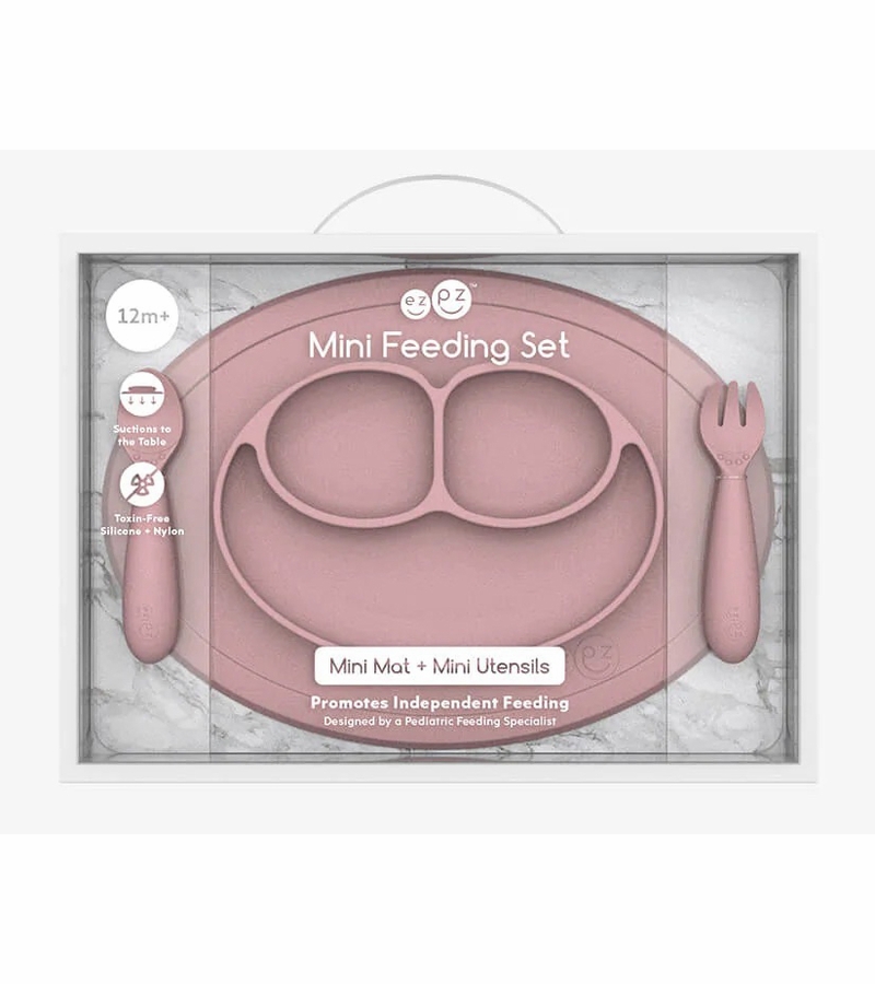 Mini Feeding Set As your infant transitions to toddlerhood, they are ready to start practicing new mealtime milestones. They are eating a balanced meal with different food groups and are learning how to eat with a spoon (scooping) and fork (piercing). With the Mini Feeding Set (the Mini Mat, Mini Spoon and Mini Fork) ezpz provides all of the developmental tools you need for independent mealtime with your toddler. Benefits: Provides the developmental tools you need to help your toddler meet mealtime milestones; Helps your toddler succeed with feeding independence; Compatible with the Mini Mat Lid; Details: Set includes 1 Mini Mat, 1 Mini Spoon and 1 Mini Fork; 100% Silicone (BPA, BPS, PVS, phthalate and latex free); Dishwasher safe; Built to last (silicone will not wear, fade or corrode); Mini Cup Training Cup + Straw Training System Learning to drink from a straw is an important developmental milestone that develops lip rounding and promotes speech development. The ezpz Mini Cup + Straw Training System teaches toddlers to drink from an open cup and safely learn to use a straw. Benefits: Helps toddlers succeed with the 3-Phase Developmental Drinking Method (by Ms. Dawn Winkelmann, M.S, CCC-SLP); Straw serves as both a Beginner Training Straw + an Advanced Training Straw; Reduces spillage; Details: Dimensions: Cup (2.5 x 3.1), Straw (4.3 x 0.35 in), Lid (1.4 x 2.1); Portion Size: 4oz; 100% Silicone (BPA, BPS, PVS, phthalate and latex free); Dishwasher safe; Built to last (silicone will not wear, fade or corrode);.