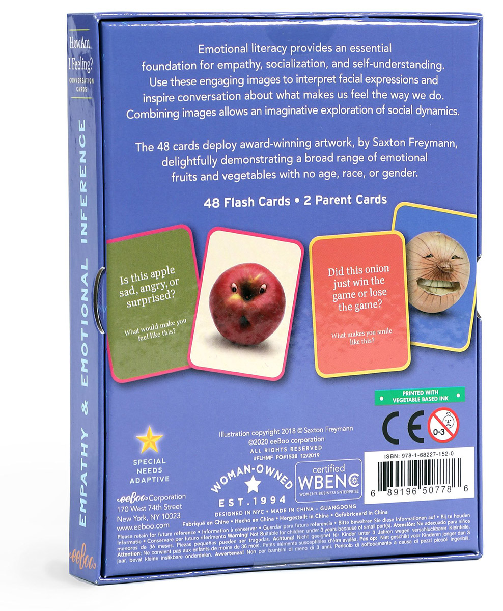 Emotional literacy provides an essential foundation for empathy, socialization, and self-understanding. Use eeBoo's How Am I Feeling? conversation cards to interpret facial expressions and inspire conversations about what makes us feel the way we do, improving our emotional intelligence. The 48 cards deploy award winning artwork, by Saxton Freymann, delightfully demonstrating a broad range of emotional fruits and vegetables with no age, race, or gender. Box: 5" x 1 " x 6 "; Card size: 4 " x 6"; 48 Cards; 2 Parent cards; Winner of the Oppenheim Platinum Award;.