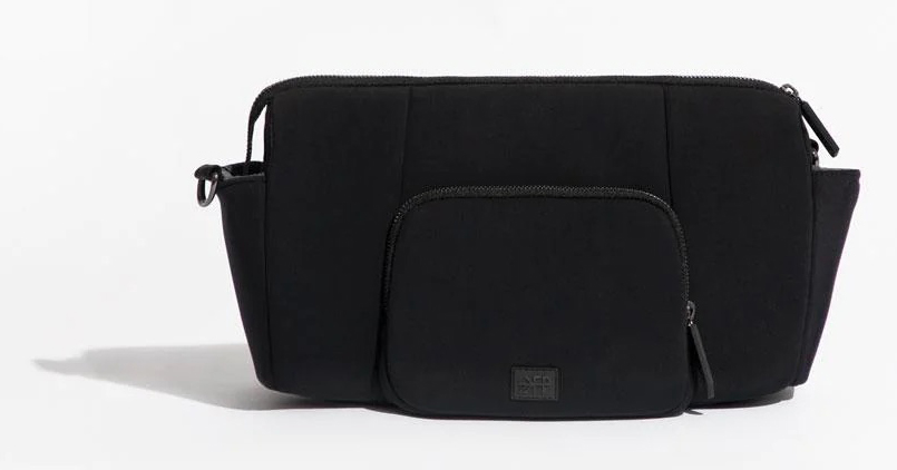 Our lightweight neoprene stroller caddy is machine washable (without the bag losing its shape) and water-resistant interior. Inspired by athleisure and everything in between, this bag is essential for mom. Easy to use with a variety of strollers! Engineered for the Mom in Motion. Stroller clips included! Features Water-resistant interior and exterior; Modern silicone logo and zipper pulls; Includes 2 nylon stroller clips ; Wide opening with full zippered top closure ; 4 compartments; 2 drink slots ; Large center compartment ; Easy access front zipper pocket that fits up to 6.7" display phone; Materials Easy to clean, lightweight neoprene material; Machine washable; We recommend a delicate cycle with cold water and mild detergent, followed by reshaping the bag and laying flat to dry. It's best to put your product in a pillow case to protect the hardware while washing it!; Metal hardware and zippers; Dimensions 7.5" H x 13.0" W x 5.25" D; Two 10.25" long stroller clips; 0.83 lbs;.