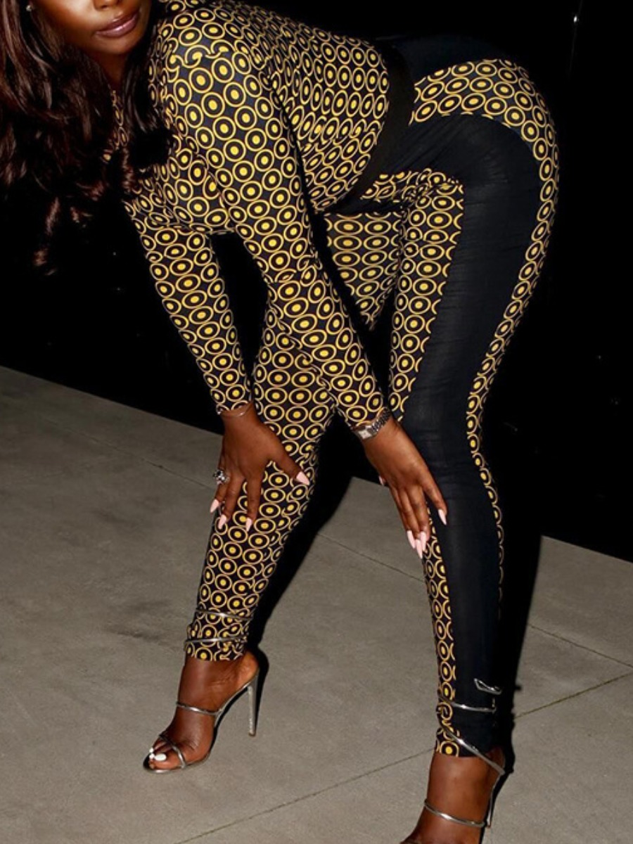 LW Street Polyester Round Neck Pattern Color Block Long Sleeve Two-piece Pants Set