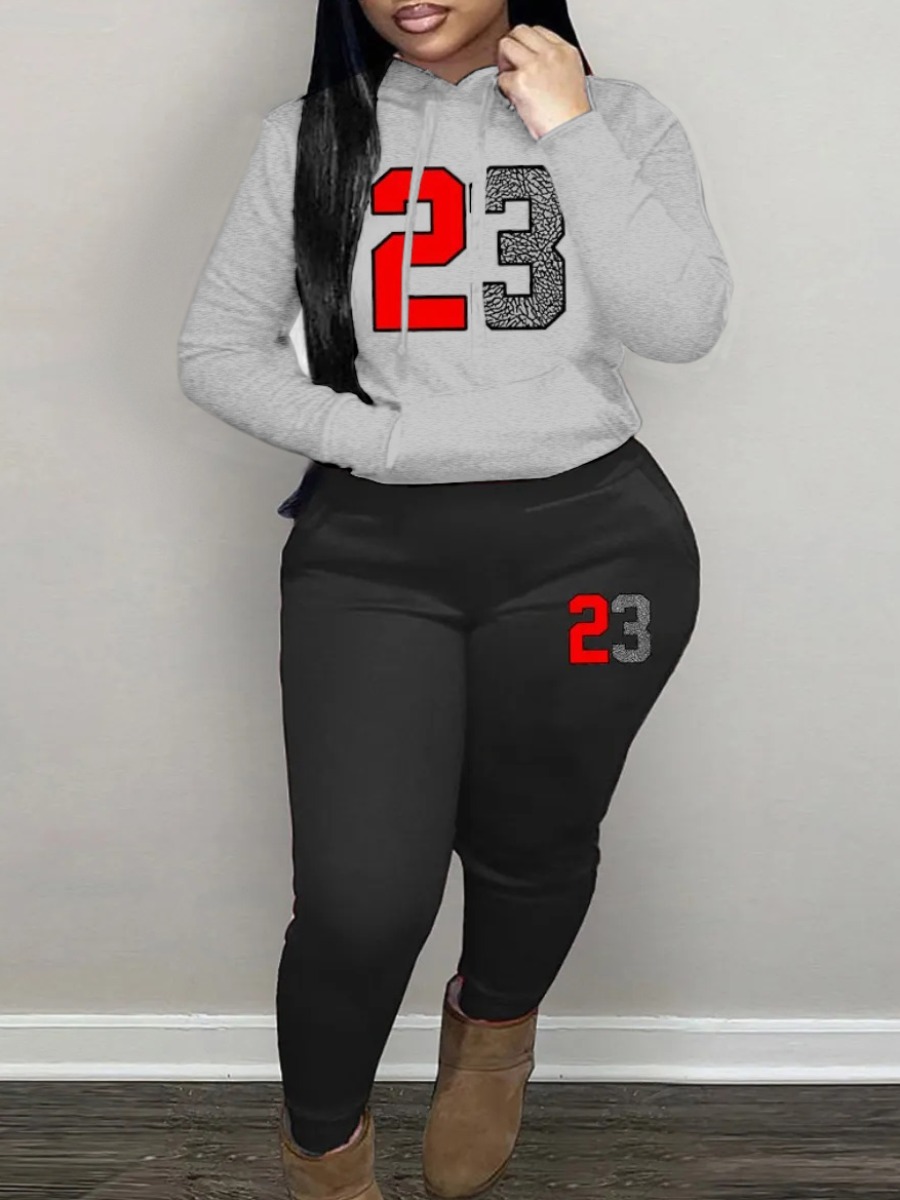 LW Casual Polyester Hooded Collar Drawstring Print Long Sleeve Two-piece Pants Set.