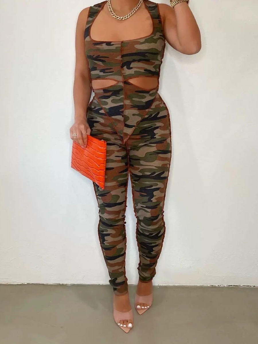 LW Casual Polyester U Neck Cut Out Camo Sleeveless Two-piece Pants Set.