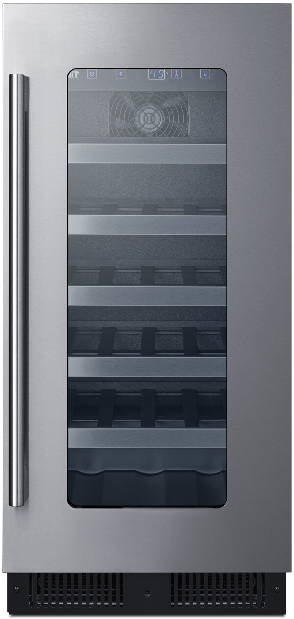 Built-In Wine Cellar with 2.2 Cu. Ft. 23 Bottle Capacity, Stainless Steel Trimmed Glass Door, Wooden Shelves, Digital Thermostat, Door & Temperature Alarm, Lock, and ADA Compliant: Stainless Steel with Stainless Steel Cabinet. Can be installed under lower ADA Compliant counters, or freestanding. Store up to 23 Bottle designed to store Bordeaux style or Burgundy style bottles. Provides a full display of your stored collection with a heat-safe double tempered design. Classic look holds up to 23 Bordeaux or Burgundy style bottles. Electronic controls for precise temperature management, with indicator lights for red, white, and sparkling wines. Alarm sounds if the door is left open for more than 60 seconds, and if the interior temperature rises out of set range. Keyed lock for a secure interior, with two keys included. Summit offers the industry's largest selection of 32" high ADA compliant appliances, with quality choices for built-in or freestanding use in wide spaces. Height of Cabinet: 31.5" (80 cm). Width: 14.75" (37 cm). Depth: 23.5" (60 cm). Depth with Handle: 25.25" (64 cm). Depth with door at 90: 37.13" (94 cm). Capacity: 2.2 cu.ft. (62 L). Bottles: 23 bottles. Defrost Type: Automatic. Door: Glass. Cabinet: Stainless Steel. US Electrical Safety: ETL. Canadian Electrical Safety: ETL-C. Amps: 1.0. Voltage/Frequency: 115 V AC/60 Hz. Parts & Labor Warranty: 1 Year. Compressor Warranty: 5 Years. Number of Zones: 1. Door Swing: RHD. Reversible: Yes. Adjustable Shelves: Yes. Shelf Type: Wood. Shelf Qty: 5. Thermostat Type: Digital. Interior Light: Yes. Refrigerant Type: R600a. Refrigerant Amount: 0.78 oz. High Side PSI: 270.0. Low Side PSI: 105.0. Interior Height 1: 21.25" (54 cm). Interior Width 1: 10.5" (27 cm). Interior Depth 1: 17.5" (44 cm). Level Legs: 4. Temperature Range: 41 to 64F. Sabbath Mode: Yes. Parts & Labor: 1-Year Warranty. Compressor: 5-Year Warranty.