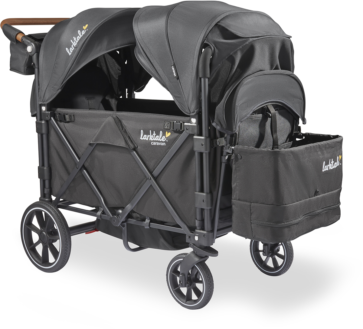 The Larktale caravan V3 has interior seating for two passengers in multi-position reclining seats and a shared drop-down footwell for comfortable stroller-style seating. This 2024 updated model includes a handlebar console, no-rethread harness system, and features a movable storage basket so users can stroll with the basket on the front of the wagon or at the rear, within arm's reach. Suitable from 6 months to 93 lbs per seat, the roomy interior can safely accommodate a newborn using a caravan car seat adapter (sold separately) or increase your seating capacity with a Double Seat Kit (sold separately). If you need space to haul cargo or let your little ones stretch their legs, simply attach the included footwell cover to provide a secure flat base interior to suit your needs. The footwell cover can even be stowed in the storage basket when not in use. The large rubber wheels and all-wheel suspension system provides easy maneuverability, putting even more activities in play such as sporting events, outdoor festivals, camping, and the beach. Parents will also love the dual adjustable sun canopies with peek-a-boo windows, height-adjustable leatherette handlebar, multiple storage compartments, included cup holder, and parent handlebar console. Features Suitable for children from 6 months up to 93 lbs per seat bench with a 207 lbs total weight capacity includingcargo.; Multi-position individually reclining seats provide comfort for each child.; Extra-large full-coverage sun canopy set featuring peek-a-book windows and a pop-out visor.; Drop-down footwell allows children a more natural seating position.; Easy-clean footwell zipper quickly releases dirt and crumbs from the footwell area.; Included Footwell Cover zips on quickly and easily to provide a supportive flat base for hauling cargo or to letyour little ones stretch out.; Large storage basket with separate vented compartment holds all your on-the-go gear and attaches to eitherthe front or the rear of the stroller/wagon. Flips up to stow away when not in use.; Stroller organizer handlebar console features additional space for beverages and multiple storage pockets forpersonal items.; Make it a triple or a four-seater wagon using the Larktale caravan, Double Seat Kits (sold separately), orattach your infant car seat using a caravan car seat adapter (sold separately).; No-rethread padded safety harnesses keep seated children secure in their seats with easy height adjustments.; Folds quickly and easily with an auto-lock to keep the caravan folded during transportation or storage.; Adjustable handlebar with leatherette grip provides a comfortable push for users of varying heights.; Four mesh interior pockets keep your child's snacks and toys within their reach.; Flip-flop friendly parking brake.; Large non-flat rubber wheels and an all-wheel suspension system provide a smooth and comfortable ride.; Lockable swivel front wheels provide extra stability on uneven terrain.; Self-leveling cup holder included.; Clear-view non-fogging deluxe rain cover included.; Spot clean or remove fabric completely to hand-wash in mild detergent. Replace fabric on frame to air dry completely before use after washing.; Specifications Age Range: Suitable from 6 months up to 93 lbs per seat; Total Weight Capacity: 207.5 lbs; Newborn Options: Car Seat Adapters available for Britax, Chicco, Maxi Cosi, Clek and Nuna infant seats; Assembled Dimensions: 49 x 25.2 x 46.5 inches; Folded Dimensions: 13.6 x 25.2 x 33 inches; Assembled Product Weight: 40.5 lbs; Adjustable Handlebar Range: 25 - 48 inches; Packaged Dimensions: 21.5 x 15 x 30 inches; Packaged Weight: 46 lbs; What's In The Box Stroller/Wagon Chassis; Sun Canopies; Cup Holder; Rain Cover; Footwell Cover; Stroller Organizer;.