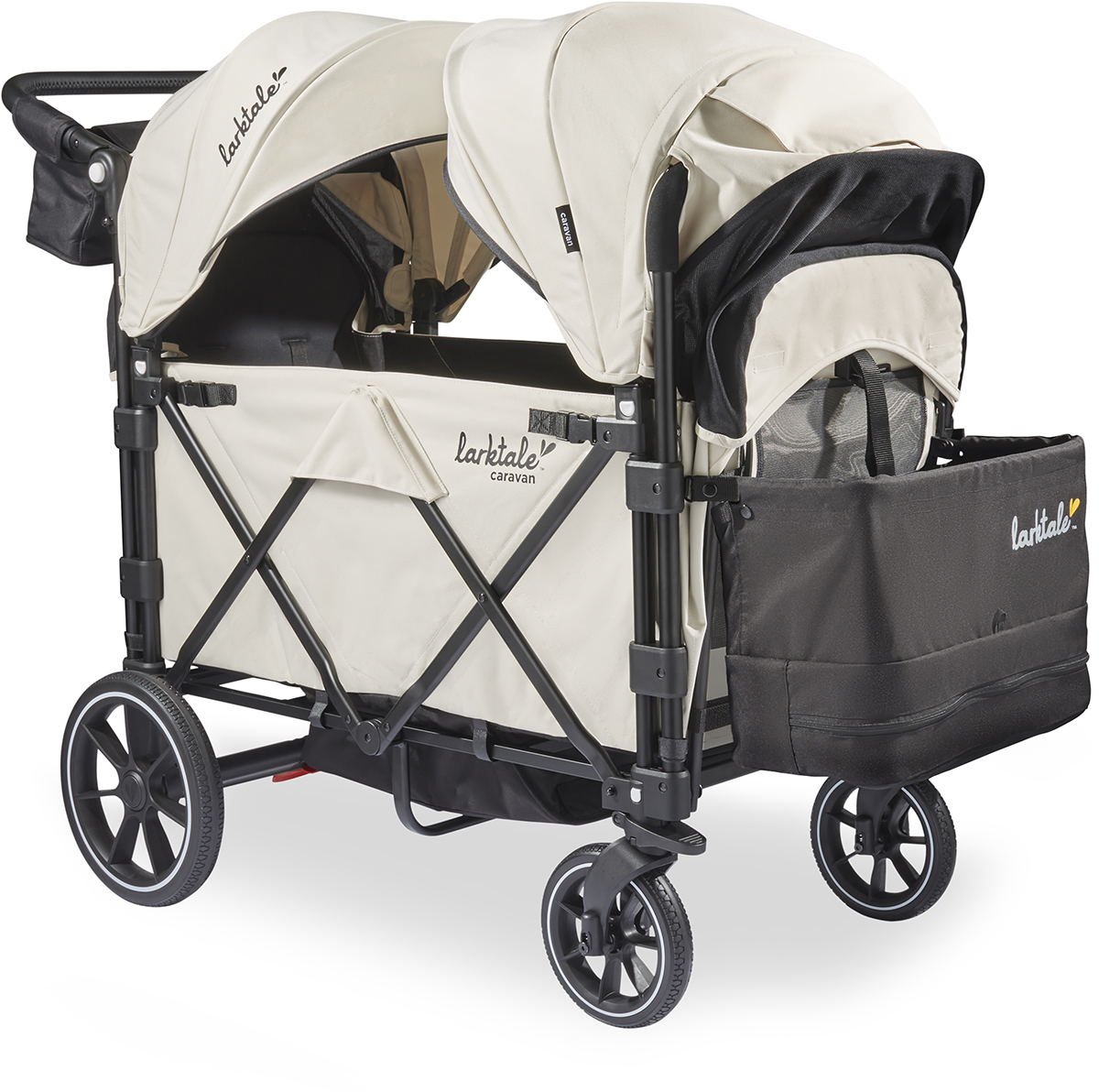The Larktale caravan V3 has interior seating for two passengers in multi-position reclining seats and a shared drop-down footwell for comfortable stroller-style seating. This 2024 updated model includes a handlebar console, no-rethread harness system, and features a movable storage basket so users can stroll with the basket on the front of the wagon or at the rear, within arm's reach. Suitable from 6 months to 93 lbs per seat, the roomy interior can safely accommodate a newborn using a caravan car seat adapter (sold separately) or increase your seating capacity with a Double Seat Kit (sold separately). If you need space to haul cargo or let your little ones stretch their legs, simply attach the included footwell cover to provide a secure flat base interior to suit your needs. The footwell cover can even be stowed in the storage basket when not in use. The large rubber wheels and all-wheel suspension system provides easy maneuverability, putting even more activities in play such as sporting events, outdoor festivals, camping, and the beach. Parents will also love the dual adjustable sun canopies with peek-a-boo windows, height-adjustable leatherette handlebar, multiple storage compartments, included cup holder, and parent handlebar console. Features Suitable for children from 6 months up to 93 lbs per seat bench with a 207 lbs total weight capacity includingcargo.; Multi-position individually reclining seats provide comfort for each child.; Extra-large full-coverage sun canopy set featuring peek-a-book windows and a pop-out visor.; Drop-down footwell allows children a more natural seating position.; Easy-clean footwell zipper quickly releases dirt and crumbs from the footwell area.; Included Footwell Cover zips on quickly and easily to provide a supportive flat base for hauling cargo or to letyour little ones stretch out.; Large storage basket with separate vented compartment holds all your on-the-go gear and attaches to eitherthe front or the rear of the stroller/wagon. Flips up to stow away when not in use.; Stroller organizer handlebar console features additional space for beverages and multiple storage pockets forpersonal items.; Make it a triple or a four-seater wagon using the Larktale caravan, Double Seat Kits (sold separately), orattach your infant car seat using a caravan car seat adapter (sold separately).; No-rethread padded safety harnesses keep seated children secure in their seats with easy height adjustments.; Folds quickly and easily with an auto-lock to keep the caravan folded during transportation or storage.; Adjustable handlebar with leatherette grip provides a comfortable push for users of varying heights.; Four mesh interior pockets keep your child's snacks and toys within their reach.; Flip-flop friendly parking brake.; Large non-flat rubber wheels and an all-wheel suspension system provide a smooth and comfortable ride.; Lockable swivel front wheels provide extra stability on uneven terrain.; Self-leveling cup holder included.; Clear-view non-fogging deluxe rain cover included.; Spot clean or remove fabric completely to hand-wash in mild detergent. Replace fabric on frame to air dry completely before use after washing.; Specifications Age Range: Suitable from 6 months up to 93 lbs per seat; Total Weight Capacity: 207.5 lbs; Newborn Options: Car Seat Adapters available for Britax, Chicco, Maxi Cosi, Clek and Nuna infant seats; Assembled Dimensions: 49 x 25.2 x 46.5 inches; Folded Dimensions: 13.6 x 25.2 x 33 inches; Assembled Product Weight: 40.5 lbs; Adjustable Handlebar Range: 25 - 48 inches; Packaged Dimensions: 21.5 x 15 x 30 inches; Packaged Weight: 46 lbs; What's In The Box Stroller/Wagon Chassis; Sun Canopies; Cup Holder; Rain Cover; Footwell Cover; Stroller Organizer;.
