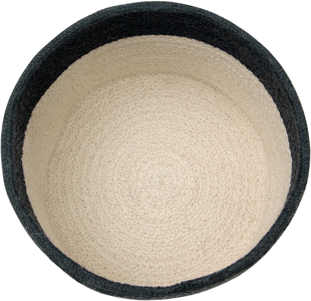 Mini-basket in Natural color and black border. The purpose of this smaller basket is to store small objects such as keys, pens, coins, etc. Every single decorative basket has been made one per one, so that there are not two equal baskets. SIZE: 9" Handmade: carefully and individually handmade by our artisans.; Eco-friendly: 100% natural cotton and non-toxic dyes.; Easy to match: you can match it with with our rugs, cushions or blankets.; Machine-washable: easy to wash, it can be washed at home in a conventional washing machine.; Composition 100% Natural Cotton.; Quality It is a handmade product, taking care of every detail.; Every basket is unique and different.; There may be minor variations in color and shape.; This product meets all the quality and safety standards for children.; The product has the ISO 9001, ISO 14001 and ISO 18001 certificates.; Environmentally responsible: non toxic or polluting dyes have been used.; Extensive quality controls to check for needles and other metals have been applied.; Made in India.;.