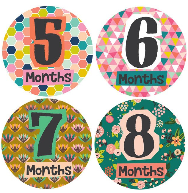 With a unique and stylish design, these monthly baby stickers are the perfect way for mommy to share her excitement. Start making darling moments in just three steps: Just PEEL, STICK onto the baby's clothing and CLICK with your camera! Adorable monthly bodysuit stickers Great baby shower gift!; Perfect photo prop; Specifications: 12 monthly stickers; Approx. 4" High-quality sticker; Pre-cut shapes; Matte "no glare" finish; Made in the USA; Responsibly Printed; Eco-friendly, soy-based inks;.