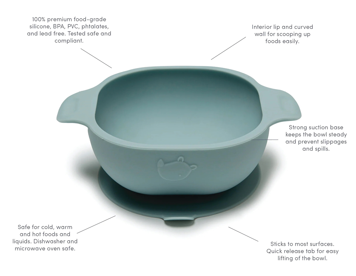 Prevent turning the mealtime into a zoo with our smartly designed-non-slip-and unbreakable silicone bowl! Features a STRONG suction base that sticks to most tables and high chairs; our silicone bowl stays put to prevent slippages and spills. Let's get ready to be bowled over; more yummy in the tummy! Recommended age: 4 m+. Size (cm) 12.25 W x 12.25 D x 5.5 H Materials: 100% premium food-grade silicone. Free of BPA-PVC-phthalates-lead and cadmium Care: Dishwasher Safe. Microwave oven safe.
