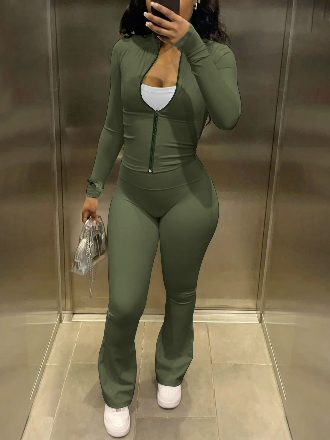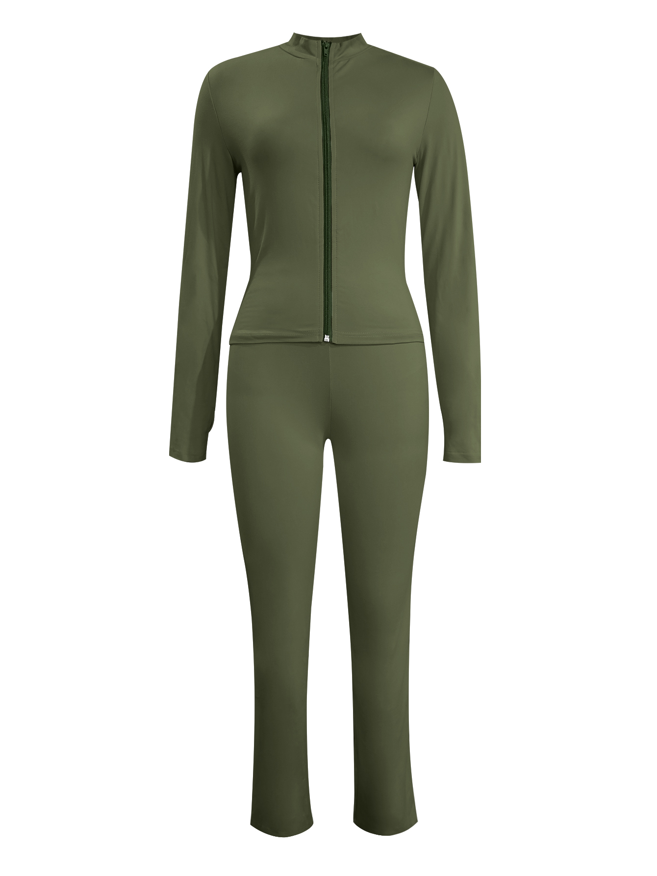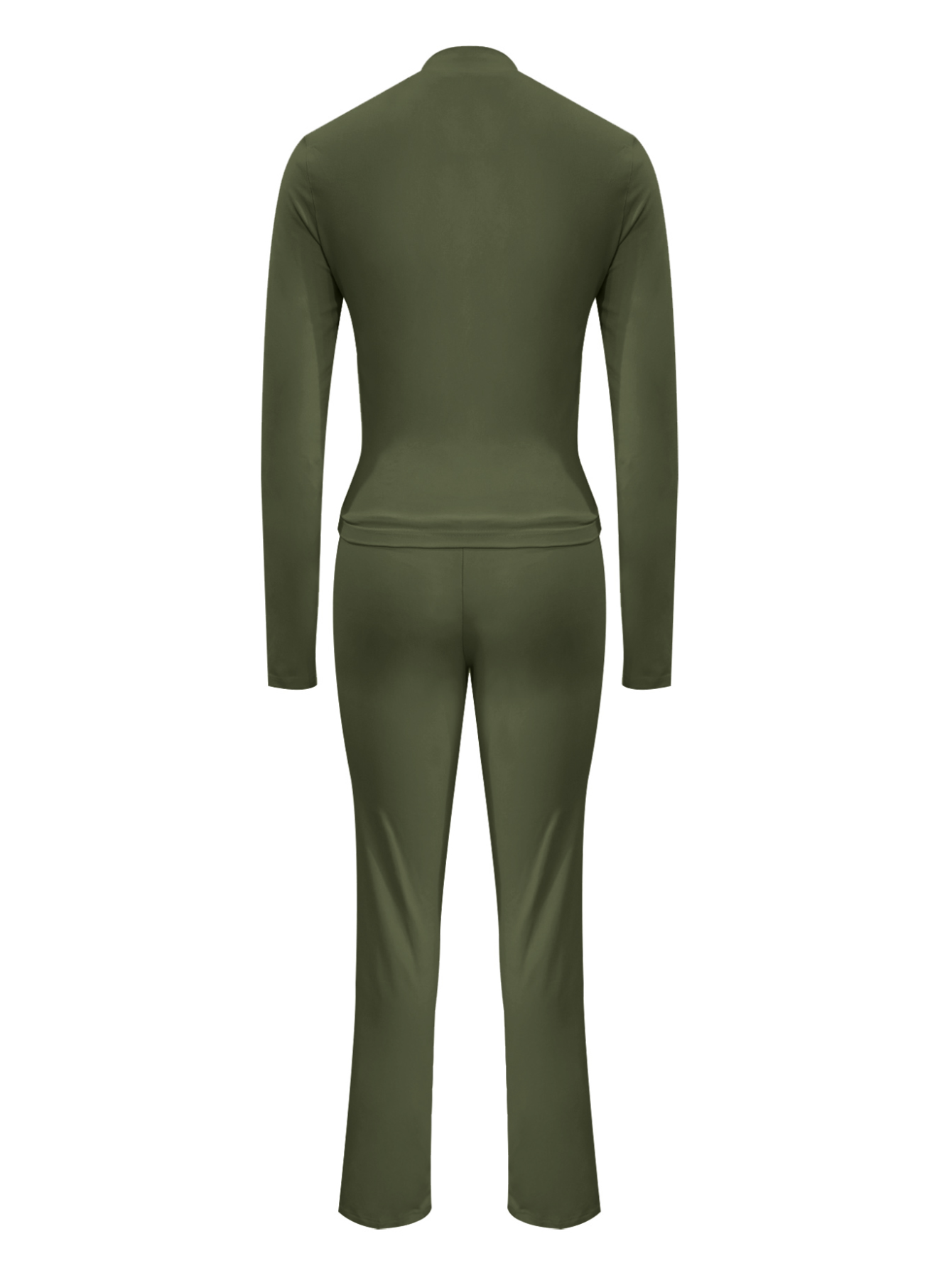 LW BASICS Casual Milk Fiber Mandarin Collar Solid Color Long Sleeve Two-piece Pants Set.