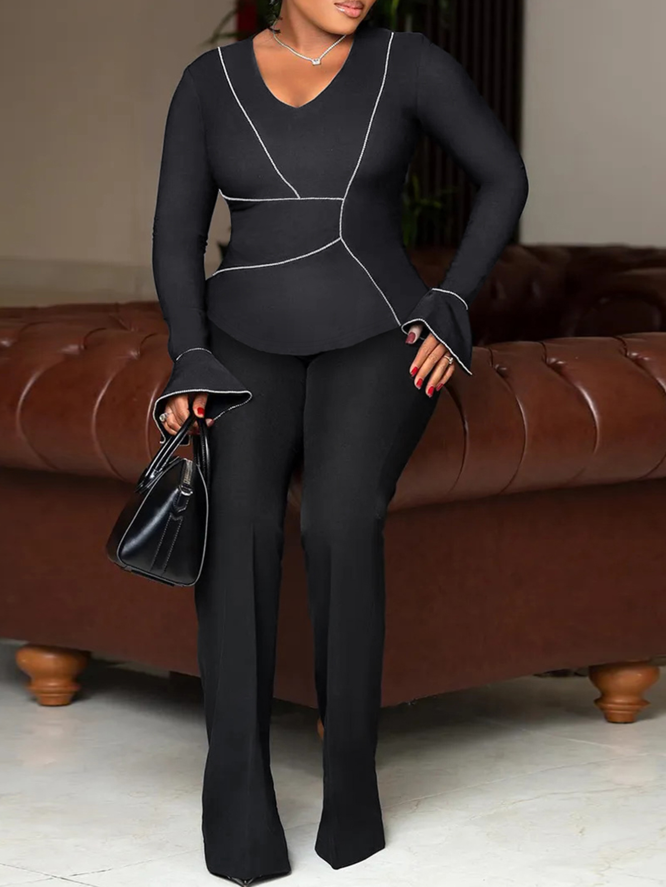 LW BASICS Plus Size V Neck Striped Flared Pants Set.