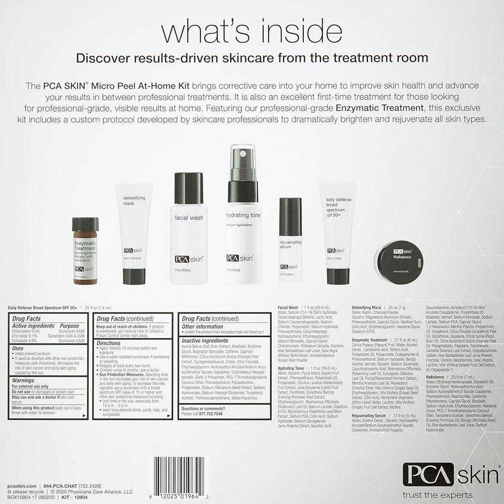 Take the steps you need to correct and improve your skin at home with the PCA Skin Micro Peel At-Home Kit. Designed to help keep up your results between those professional treatments or to step into professional-grade dramatically boosted results at home it was developed by skincare experts to brighten and rejuvenate. The first step is to cleanse with PCA Skin Facial Wash followed by the Hydrating Toner to ensure skin is completely clean and hydrated prior to the Detoxifying Mask. Then the PCA Skin Enzymatic Treatment can be applied a superficial peel with AHAs and enzymes to strengthen brighten and let skin glow. Finally youll add ReBalance to deliver soothing moisture and nourishment followed by the Daily Defense Broad Spectrum SPF 50 to protect post-peel skin and keep it looking its best! Benefits: Includes necessary products for successful at-home peel Gently exfoliates Hydrates and conditions to leave skin glowing immediately Safe for all types of skin Brightens and rejuvenates [ Kit Contains: Hydrating Toner Spray 1oz Detoxifying Mask 0.25oz Facial Wash 1oz. Rejuvenating Serum 0.17oz Daily Defense SPF 0.25oz ReBalance 0.25oz Enzymatic Treatment 0.25oz ].