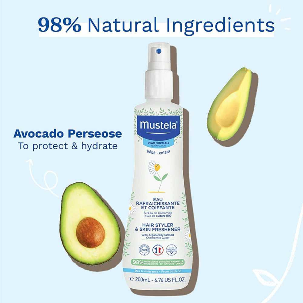 The Mustela Hair Styler & Skin Freshener is a refreshing multi-purpose spray designed to gently style babys hair while hydrating and soothing delicate skin. Enriched with chamomile and honey extract this lightweight non-sticky formula provides natural hold leaving babys hair soft shiny and easy to manage. Perfect for quick touch-ups or refreshing between baths it also provides a light fresh scent that keeps baby feeling clean and refreshed throughout the day. Benefits Gentle Hair Styling : Softly holds and styles babys hair without stiffness leaving it smooth and manageable. Hydrates and Refreshes Skin : Chamomile and honey extracts provide gentle hydration and soothing benefits for the skin. Fresh Delicate Scent : Leaves babys hair and skin with a light natural fragrance that refreshes instantly. How to Use Spray a small amount onto babys hair or skin as needed. Gently comb through or pat with your hands to style the hair. Avoid contact with eyes. Use daily or as needed to freshen up and style. [ 6.7 fl oz ].
