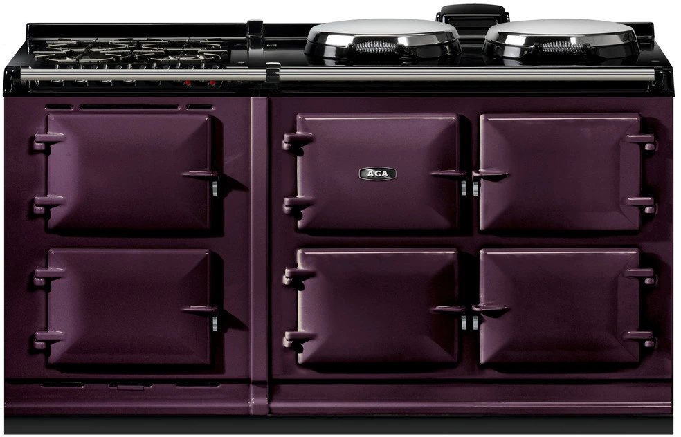 Freestanding Dual Fuel Range with 2 Hotplates, 4-Top Gas Burners, Boiling Plate, Simmering Plate, 5 Ovens, and Roasting Oven: Aubergine. The two hotplates are at different heats; the boiling plate is the hottest of the two and the simmering plate is a lower heat. Each plate is individually controlled. Provides instant power and a rapid response for any type of cooking. Delivers a really fast punch of heat for quickly boiling water, maintaining a rolling boil, and for fast stir-fries in a wok. Ridged griddle pans are also used here for authentic grilled steaks, chops, and cutlets. Designed for slowly bringing foods to a gentle simmer. Use it for heating milk, scrambled eggs, and for making sauces - even tricky emulsion sauces, such as Hollandaise and Bearnaise, become easy. The hottest oven for high-temperature cooking; pastries bread, roasting of meat, vegetables, and poultry, grilling at the top of the oven, and frying on the base of the oven. A moderate oven for cooking cakes and biscuits, baking fish, lasagne, or shepherds pie, plus roasting meat and poultry at medium heat. Cooking sweet and savory dishes together is no problem as the flavors do not mix. Long, slow cooking in the simmering oven develops flavors and makes the toughest meat tender. Its large capacity means several pans can be stacked here; soup, casserole, steamed rice, steamed carrots, and poached fruits all cooking simultaneously, without any danger of burning. Ideal for a broad range of long slow cooking applications, such as leg of lamb, pulled pork, belly pork, and celebration cake. Used for warming plates and serving dishes. Can also be used for resting joints before carving. The distinctive hallmark of the AGA, the highly polished stainless steel insulated covers are brought down over the hotplates to contain the heat when on and protect the hotplate when off. Individually assembled by hand. The enamel top surrounds the hotplates. It will become warm when your hotplates are in use. Although it is not a cooking surface it may be used to keep foods warm, melt butter, and dehydrate leafy herbs. New cooler-touch stainless steel door liners on the roasting, baking, and simmering ovens. For ease of cleaning, these new patented door liners can be removed and placed right in the dishwasher. The AGA R7 ranges feature a discreetly housed control panel for all oven operations. A special Altrashell coating seals the surface of the cast-iron ovens making them easier to clean. Series: Classic Cast Iron Collection. Cooktop: 2 Hotplate + 4 Gas Burners. Number of Ovens: 5. Cooktop Control Type: Knobs. Oven Control Type: Knobs. Fuel Type: Dual Fuel. Exterior Width: 63". Width: 62 9/16". Depth: 27 1/2". Height: 36". Shipping Weight: 1263 lbs. (includes range, crate & pallet). Warranty: 1 Year Warranty for parts and labor, subsequent 4 years - parts only.