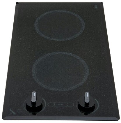 21" Two Burner Trimline Electric Cooktop with 120 Volt, Push to Turn Controls, Heat Control, Quick to Heat, Heat Limiting Cooking Surface Protectors, ON Indicator Light, Hot Burner Indicator and 3 Year Warranty. Smooth black surface with white graphics, black knobs, and rounded edge ceramic glass. Durable ceramic glass is easy to clean. Heat-limiting cooking surface protects for safety "On" & "Hot" burner indicator lights. Push-to-turn knob control. Voltage/ Amps: 120 V AC 50/60 HZ - 20 Amp. Watts: 2 - 6 1/2 (165MM) @ 1200 Watts. Plug Type: 3-Prong 5-20 Nema Plug. Overall Dimensions: 21 X 12 X 3 1/4. Cutout Dimensions: 20 X 10 3/4 WITH 1/4 Radius.