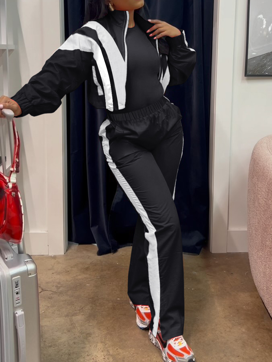 LW Casual Tatting Turndown Collar Patchwork Color Block Long Sleeve Two-piece Pants Set.