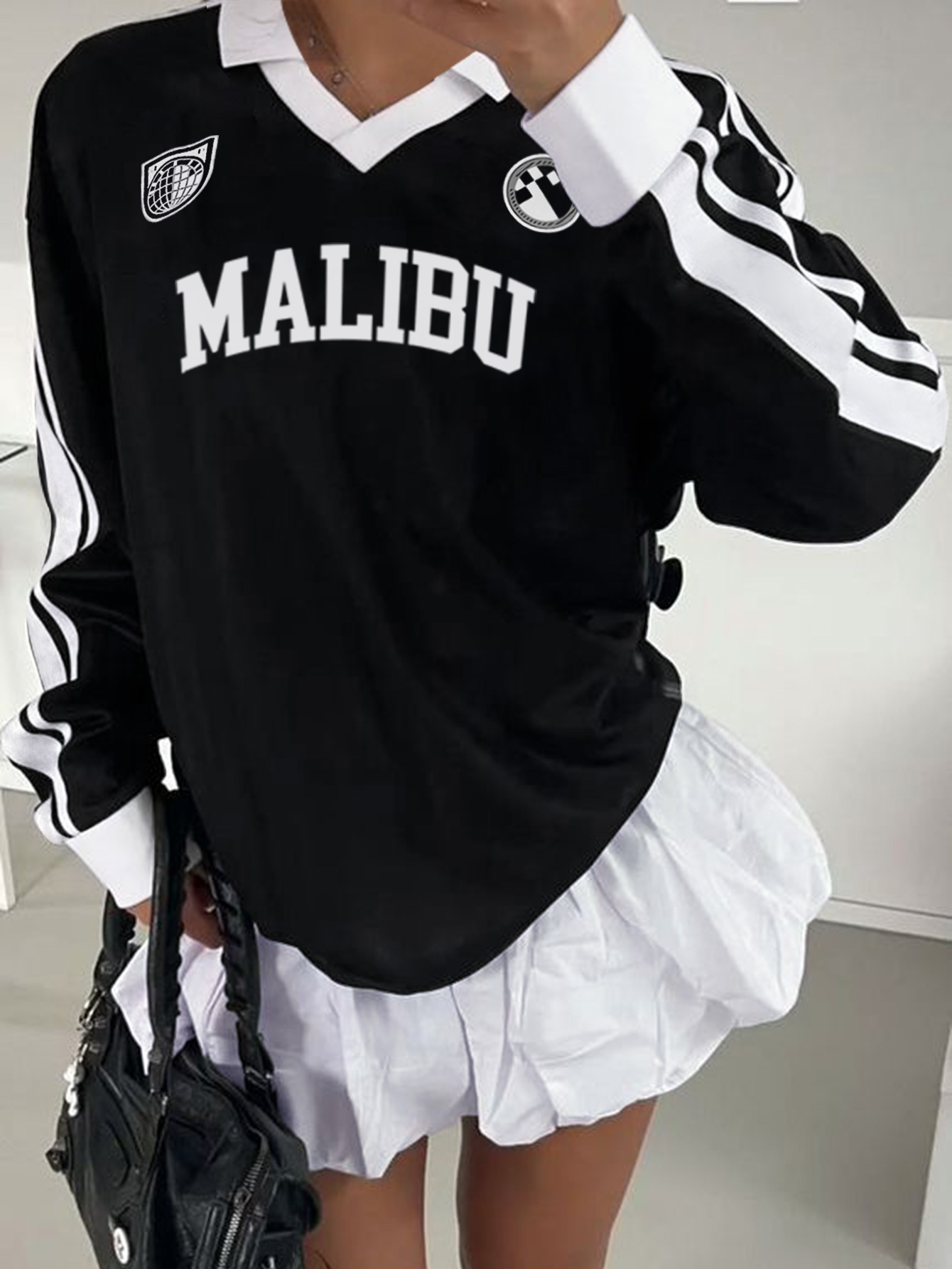 LW Casual Tatting Sweat Turndown Collar Patchwork Letter Long Sleeve Two-piece Skirt Set
