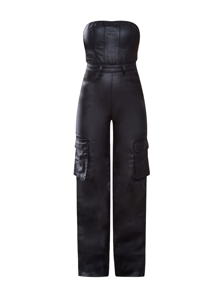 LW SXY Faux Leather Off The Shoulder Side Pocket Jumpsuit.