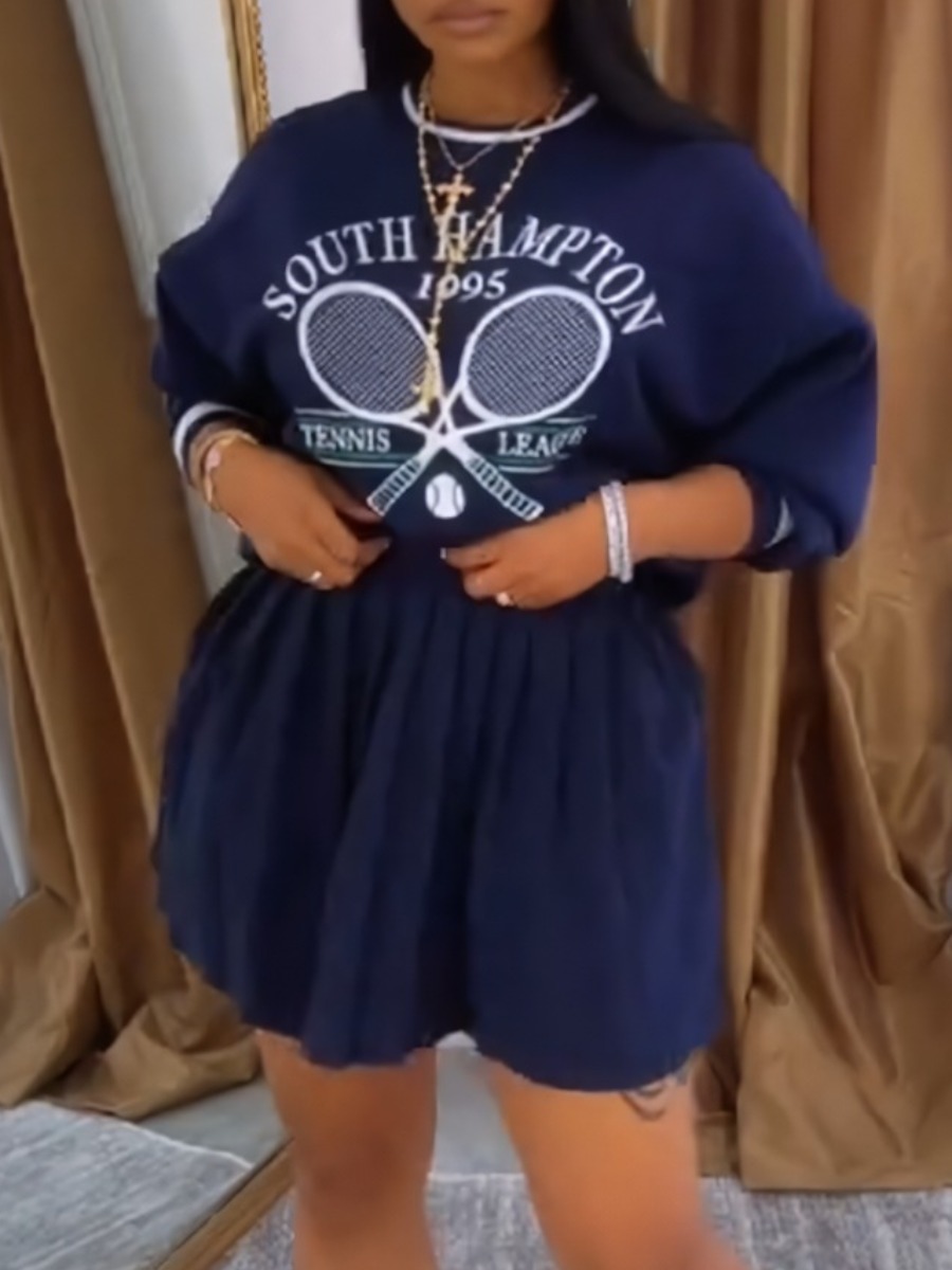 LW Casual Polyester Round Neck Pattern Mixed Print Letter Long Sleeve Two-piece Skirt Set