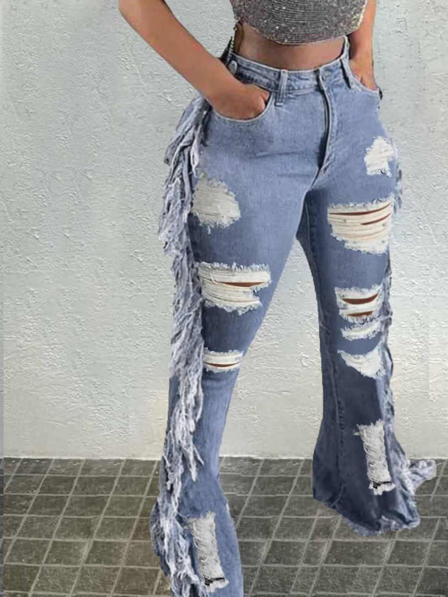 Buy LW High Waist Tassel Design Ripped Pocket Pierced Skinny Micro Elasticity Jeans for $24.29 at @ Lovelywholesale.com