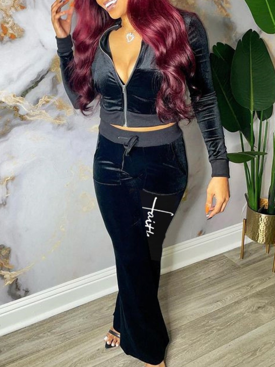 LW Casual Polyester Turndown Collar Zipper Design Letter Print Long Sleeve Two-piece Pants Set