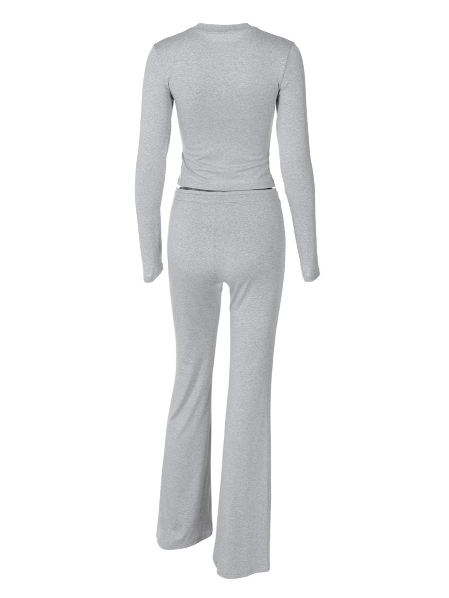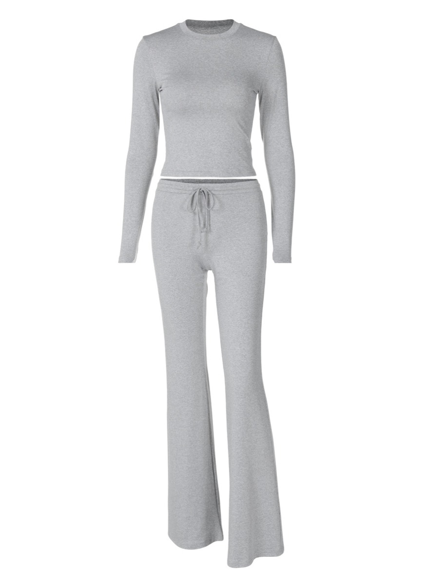 LW BASICS Casual Polyester Round Neck Bandage Design Solid Color Long Sleeve Two-piece Pants Set.