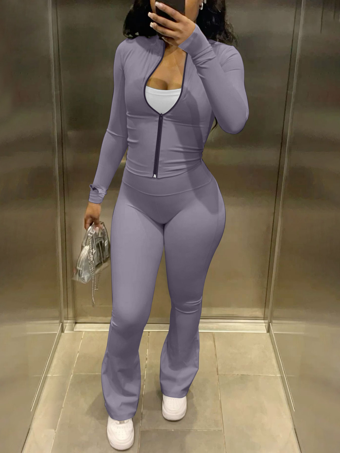 LW BASICS Casual Milk Fiber Mandarin Collar Solid Color Long Sleeve Two-piece Pants Set.