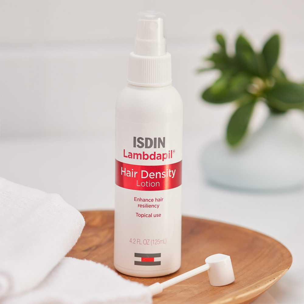 ISDIN Lambdapil Hair Density Lotion is a topical treatment designed to strengthen and nourish the scalp promoting hair density and fullness. Enriched with active ingredients this lotion helps stimulate hair follicles supporting healthier hair growth. It is ideal for individuals experiencing thinning hair or seeking to improve hair thickness and overall volume. The lightweight formula absorbs easily without leaving a greasy residue making it suitable for daily use. With consistent application ISDIN Lambdapil Hair Density Lotion helps improve scalp health and boosts hair density contributing to stronger fuller-looking hair over time. Benefits: Thickness: Favors hair thickness through a combination of select ingredients. Nutrition: Supplies hair and hair follicles with targeted nutrition. Strength: Strengthens hair while promoting volume and thickness. How to Use: Apply once daily 5 to 7 days per week at night to the scalp (approximately 14 sprays). Massage gently after application. An extended applicator tip is included for easy application in areas with longer hair to ensure more accurate application. To use the extended applicator tip remove the shorter tip and snap it onto the bottle. [ 4.2 oz ].