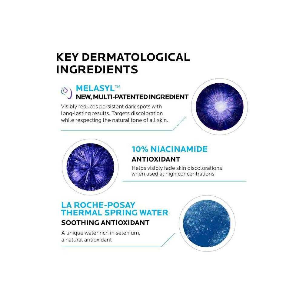 Introducing La Roche-Posay's Mela-D B3 Dark Spot Serum a potent targeted solution meticulously crafted for those looking to visibly reduce the appearance of dark spots and enhance their skin's overall radiance. This advanced formula is infused with a high concentration of Vitamin B3 (Niacinamide) and a carefully selected blend of exfoliating ingredients designed to work synergistically to diminish dark spots hyperpigmentation and uneven skin tone. Vitamin B3 known for its powerful brightening properties works at the heart of this serum to help correct discoloration while the exfoliating complex gently removes dead skin cells revealing a smoother more luminous complexion. This serum is formulated to be gentle yet effective suitable for daily use on all skin types including sensitive skin. Its lightweight fast-absorbing texture ensures a seamless application quickly penetrating the skin to deliver its active ingredients where they're needed most. Regular use of the Mela-D B3 Dark Spot Serum not only addresses existing dark spots but also prevents the formation of new ones promoting a clearer more even-toned complexion over time. Benefits: Visibly reduces a range of skin discolorations including sunspots age spots post-acne marks (or post-inflammatory hyperpigmentation) Helps visibly correct even stubborn dark spots Respects skin's natural tone Powerful visibly lasting results - continues to maintain improvement 2 weeks after use* Reveals brighter and more radiant skin Skin imperfections look reduced after 2 weeks How to Use: QUANTITY 3-4 Drops. WHEN Morning & evening. After your face cleanser. WHERE Face & neck. Avoid eye area. APPLICATION TIP Gently massage serum into skin with your fingertips. [ 1 fl oz ].
