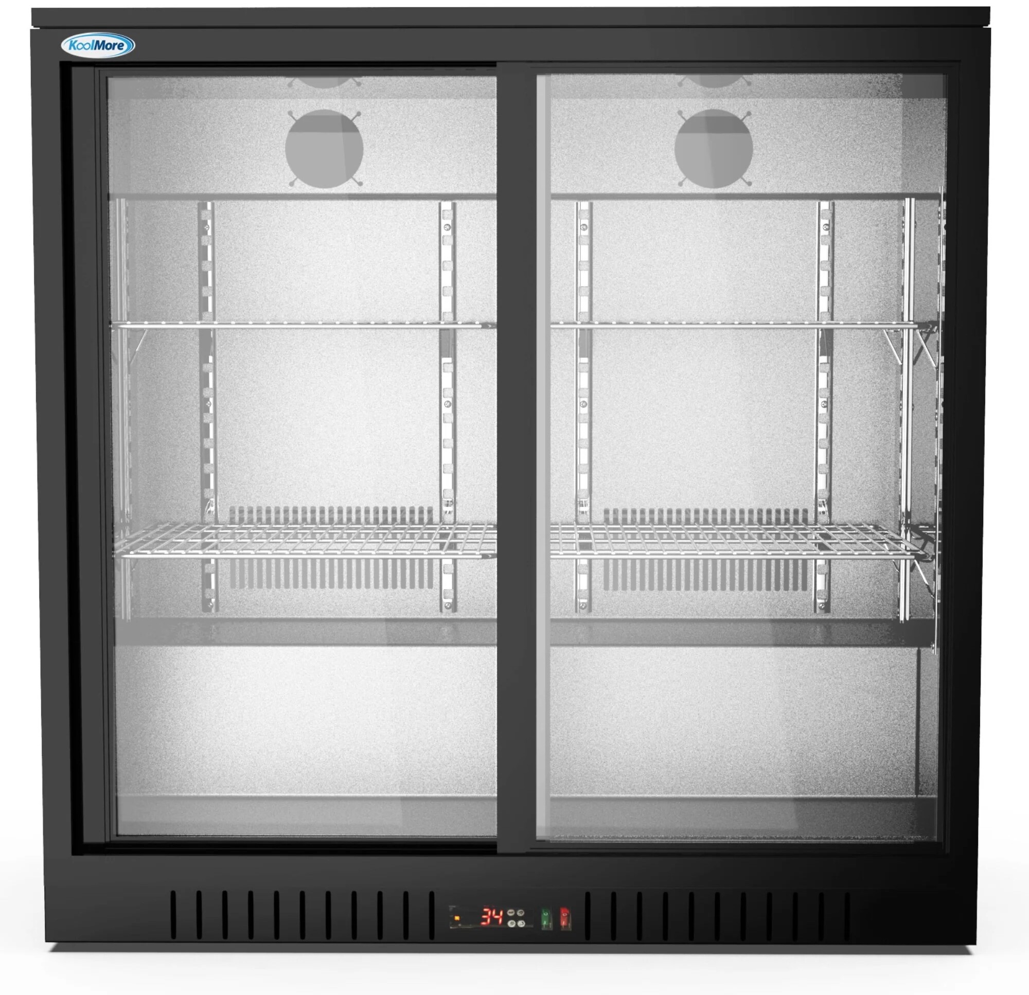 35" Freestanding Commercial Two-Door Beverage Center with 7.4 Cu Ft. Capacity, LED Lighting, Adjustable & Removable Shelves, ETL Listed, and NSF Compliant. Sensor that detects the temperature and automatically switches into auto defrost mode when the temperature reaches freezing point. LED lighting with an independent switch. A spacious interior with two adjustable & removable shelves. Glass swing door will help you keep track of inventory to continually keep a full supply. Digital temperature display and controls to monitor and adjust the temperature. Easy to maintain with a self-evaporating water pan and a lock, to keep product secure. Two half-inch adjustable feet for height flexibility. Compliant to ANSI 7 Standard for commercial refrigerators and can be used in all types of commercial and residential settings. Cubic Feet: 7.4. Casters: No. Color: Black. Compressor Location: Bottom Mounted. Interior Construction: Aluminum. Exterior Construction: Painted Steel. Door Style: Sliding. Door Handle: Horse Power: 1/10 HP. Individual Shelf Capacity (lbs.): 90. Number of Shelves: 2. Refrigerant Type: R-600a. Pre-set Temperature (F): 35-46. ETL Listed: Yes. NSF Certified: Yes. Parts & Labor: 1 Year. Compressor: 5 Year. Amps: 1.2. Hertz: 60. Voltage: 115. Length (in.): 35.4. Width (in.): 20.5. Height (in.): 35.4. Weight (lbs.): 136. Interior Width (in.): 32.2. Interior Depth (in.): 16. Interior Height (in.): 30.