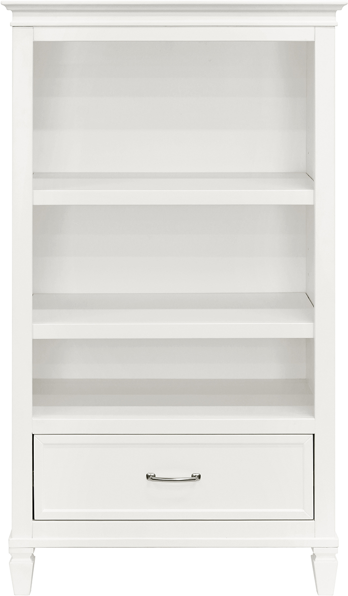 The Darlington Bookcase is a classic French country inspired storage solution for the home. The elegant bookcase features two open and adjustable shelves for displaying your child's many books and treasures; customize and style it as baby grows into a toddler. With its classic raised molding, delicate feet detailing, and satin nickel accent drawer pull, the Darlington is an effortless piece to incorporate within the home. Two open and adjustable shelves; One spacious dovetail drawer with a satin nickel finished handle; Sleek tapered feet and recessed front and side panel molding; Single drawer designed with self-closing and ball-bearing drawer glides with stop mechanism; Anti-tip kit included for additional security; Finished in non-toxic multi-step painting process, lead and phthalate safe; Made with hardwood, basswood veneer, CARB II compliant MDF and plywood; Meets ASTM International and US CPSC safety standards; Minimal assembly required, just attach the feet; Specifications Made in Vietnam; Assembled Dimensions: 30"L x 17.50"W x 54"H; Assembled Weight: 105lbs; MAXIMUM WEIGHT: 80 lbs;.