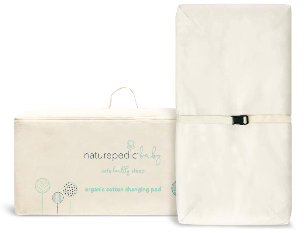 The Naturepedic Organic Cotton 4 Sided Changing Pad is a deluxe contoured pad featuring organic cotton filling and fabrics. It comes with snap-screws to easily secure to any dresser as well as a child safety buckle to help keep the baby in place while changing. A non-toxic waterproof surface made from 100% food-grade polyethylene easily wipes clean with a damp cloth. Meets the strictest GREENGUARD certification standards for eliminating chemical emissions making this pad an excellent choice for parents seeking to remove potentially harmful chemicals from their baby's nursery. Wipe clean waterproof surface so pure it meets food contact standards; 4-Sided contoured design helps keep baby positioned; Safety buckle secures baby while changing; Easy snap-screws secure pad to dresser; Certified organic cotton fabric & filling; Air-Core technology for structural support (100% food-grade polyethylene); Safe hypoallergenic design free from harmful chemicals; Measures 16.5? x 33? x 4?; Made in the U.S.A.;.