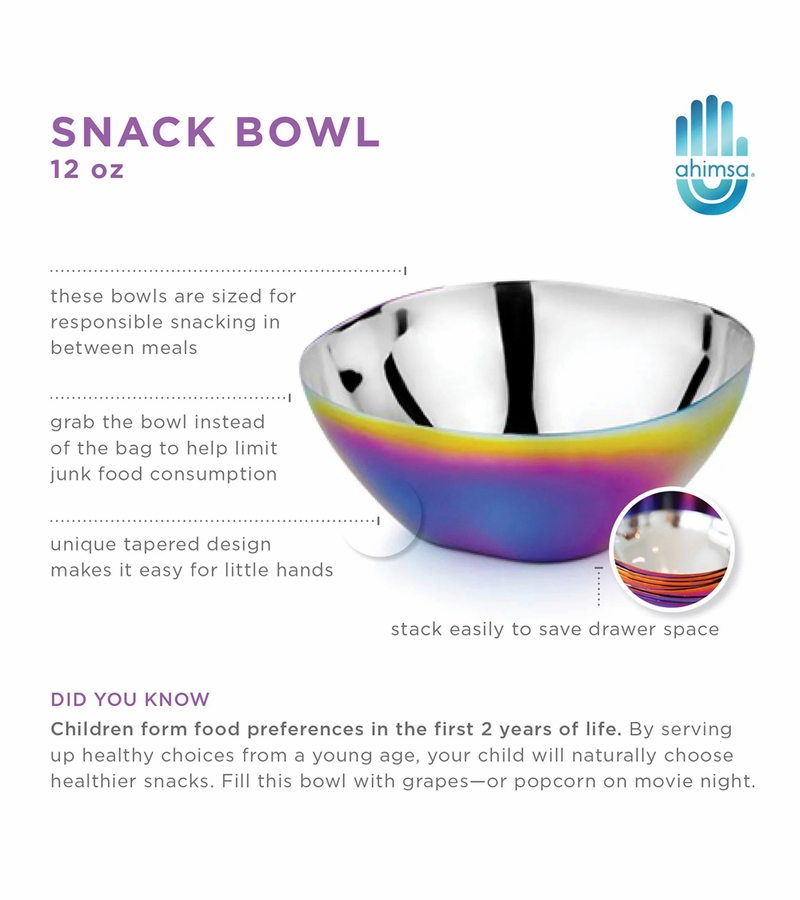 Pediatrician-mom designed to encourage healthy snacking. Plus, the unique tapered shape is perfect for little hands. Great for snacks, pasta, soup, dips, cereal and more. For ages: 12 months+ Benefits: It's stainless steel so unlike plastic - harmful chemicals won't transfer into child's food. Our dishes are free of BPA (and all bisphenols), PVC, Phthalates, Melamine & Lead.; Built to last a lifetime, no peeling or breaking.; Versatile - great for toddlers to adults. ; Dishwasher safe.; Stackable.; Dimensions & Details Dimensions; Each bowl: 4.6 (w) x 4.6 (l) x 1.9 (d) inches; 12 oz; Food-safe, grade 304 18/8 stainless steel; Actual product colors may vary from how they appear on your monitor. Each product's colors are unique due to our non-toxic coloring process.;.