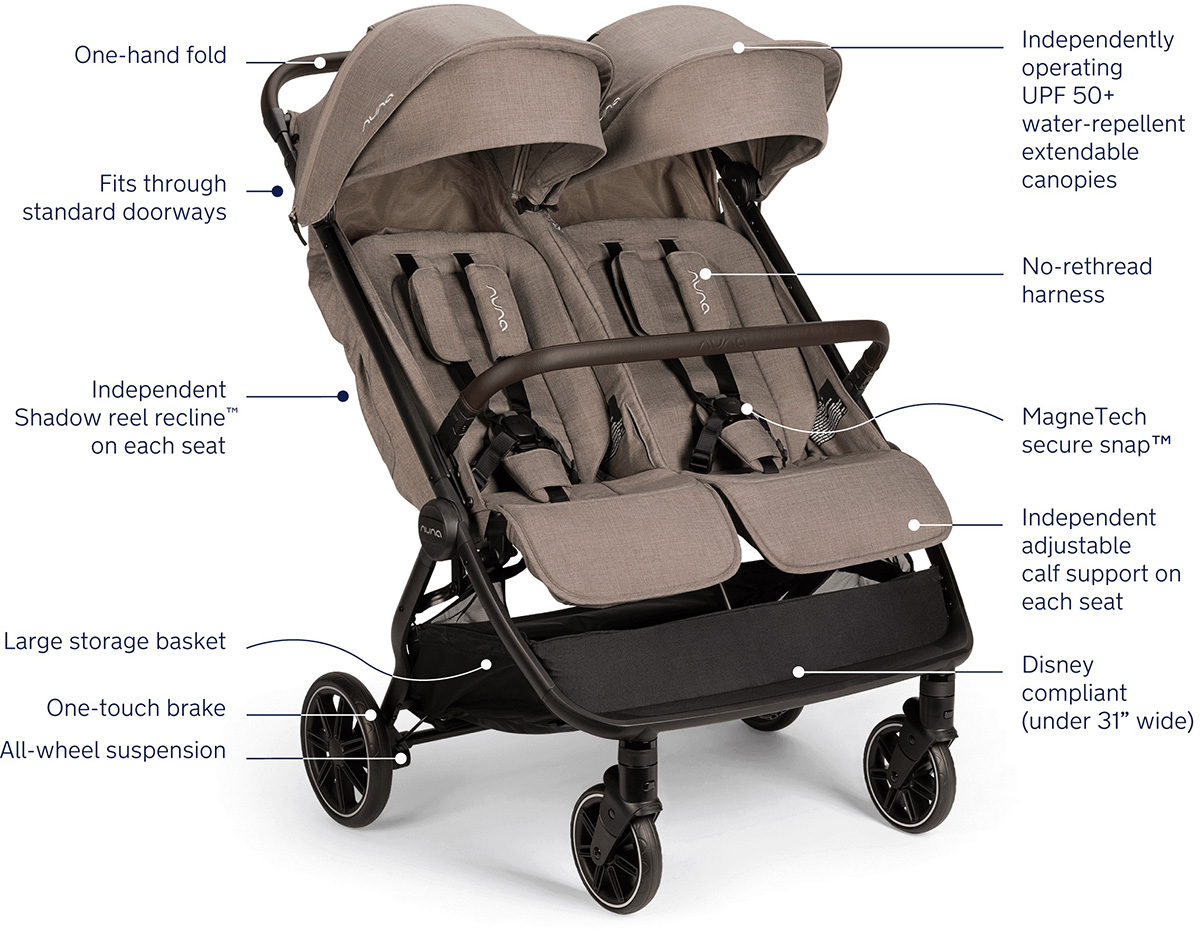 Nothing about being a parent is what it seems. It's magical, scary, overwhelming, and full of changes-identity, style, body, work, travel. As your tribe grows, the answer to "What am I forgetting?" often becomes "Ah yes, myself!" Then, you begin to recognize the importance of self-care and embracing parenthood on your own terms. Meet your new superpower, the TRVL dubl. This side-by-side double stroller becomes your lifeline, easily integrating into the multiplying demands of your day.It glides through doorways, navigates narrow spaces, and brings your two little explorers closer together for the journey. Because life doesn't have to slow down when your family expands, the fun just doubles. Features Use Comfortably seats two children side-by-side from birth up to 50 lbs per seat; Travel system ready-attach any PIPA series infant car seat to the wider seat without an adapter; Removable and rotating armbar spans across both seats for easier ins and outs; Folds easily with 1 hand and stands on its own when folded; At 25.2 lbs it's lightweight for a double and easy to tote with armbar when folded; Safety Self-guiding MagneTech secure snap buckles automatically lock into place; 3 to 5-point no-rethread harness makes it easy to fasten them in; Quick-engaging 1-touch rear-wheel braking system provides scuff-free security; Front swivel wheels with swivel locks for more comfortable strolls on uneven terrain; Comfort Seats and canopies are completely independent of one another for customized strolls for two; Shadow Reel recline provides 1-handed independent recline adjustments with a more upright option; Near flat recline and calf support that raises to convert seats to a carriage position for keeping the littlest babies extra cozy; UPF 50+ water-repellent canopies are extendable and feature a flip-out eyeshade and peek-a-boo window; Durable footrest provides a resting place for tired feet; 2-position adjustable calf support for growing legs; Premium details Slender enough to fit through standard doorways and narrow aisles for convenience without compromise; At 30.5 in wide it meets the size and design requirements set by various amusement parks and is Disney-compliant (Check park guidelines for restrictions); Exceptional maneuverability makes it a dream to push and turn even with two; All-wheel suspension and durable EVA foam-filled tires are ready for any terrain; Easy access extra-large storage basket holds up to 22 lbs; Luxe leatherette accented pushbar and removable armbar lend style to your stroll; Included rain cover for when the weather doesn't cooperate; Specifications Recommended Use: Up to 50 lbs per seat; Stroller dimensions: L 37.5 in x W 30.5 in x H 45 in ; Stroller dimensions (folded): L 19.75 in x W 30.5 in x H 27.75 in; Weight: 25.2 lbs; PIPA Aire RX Infant Car Seat Who says security can't be super stylish? Lighten your load and up your style game. That's the PIPA aire rx motto. Whether it's the sleek design elements or the smart security features that catch your eye, the PIPA aire rx car seat is all about hassle-free adventures with all the perks. Light on weight, heavy on style, it's your go-anywhere, do-anything partner that's in it for the long haul. In the world of PIPA aire rx, casual meets cool, and carrying less is the ultimate flex. Now, you can carry less, do more, and look good doing it. Your refined taste for baby adventures deserves an equal match. Features PIPA aire rx The PIPA aire rx is lightweight with zero compromises; A lightweight full-featured infant car seat; Ideal for city living and taxis as it can be installed with a vehicle seat belt and no base; Integrated magnetic buckle holders keep straps out of the way when buckling baby in; Fabrics and inserts are conveniently machine washable; FAA certified for aircraft use with or without a base; Connects with all Nuna strollers to create a stylish travel system*; 5-second steel-reinforced True lock installation makes set up swift, simple, and safe**; Side Impact Protection (SIP) for ultimate baby safekeeping; Open belt path with lock off secures lap and shoulder belt; Features Aeroflex foam that is cleverly lightweight, resilient, and minimizes force transferred to baby; 3-position height-adjustable headrest and 5-point harness keeps little ones in place; Removable infant head and body inserts nestle baby in comfort and security; Tailor tech memory foam seat panel and headrest provides a comfortable custom fit; UPF 50+ canopy with 2 positions and a flip-out eyeshade protects from sun exposure; The iconic Sky drape provides baby with ultimate privacy for quiet moments; Soft yet durable micro-knit fabric for refined style and casual warmth; Super-resilient top-of-the-line plastics for a heavy-duty secure shell; Exposed aerospace aluminum handle adds a contemporary aesthetic and enhances the seat's intuitive functionality; Luxe leathere.