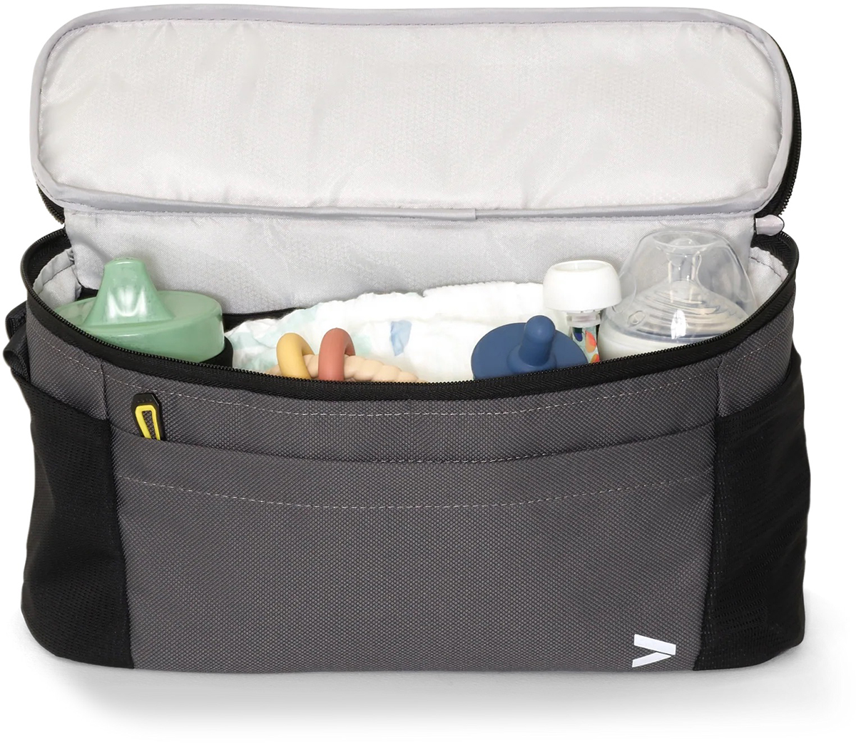 Veer's Parent Organizer is the one you need. Attaches securely to any Cruiser, Switchback Seat, and the &Roll and &Jog frames to provide storage for keeping essentials accessible and secure. It stores infant bottles, sippy cups, wipes, diapers, phones, keys, or whatever else you may need to keep handy. Features Easy access fold back lid with zipper; Separate front zippered phone pocket; Collapsible insulated interior bottle holders; Water-resistant fabrics; Durable elastic mesh pockets; Fold away, adjustable Nylon webbing straps with Velcro; Swing stopping strap for cruiser handle tube; Integrated Cruiser hooks and elastic loops; Stands on tabletop when being loaded; Specifications Dimensions: 12.5" L x 4" W x 7" H; Capacity: 2.5 lbs; Weight: 0.8 lbs;.