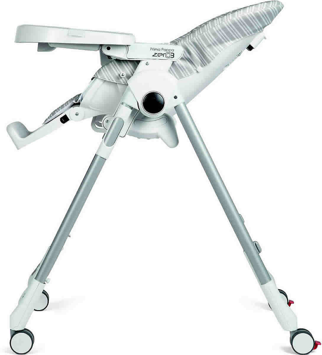 The Prima Pappa Zero 3 is the latest addition to the Peg Perego family. Ultra-light and yet multi-functional, it grows with your child from 0 to 3 years of age. During the first months it is a comfortable recliner, as baby grows it can be used as a high chair for feeding and playing. The removable tray and different height settings allow baby to sit with you at the table. The Prima Pappa Zero 3 offers convenience and functionality in the form of an ultra-compact high chair! Weighing under 17 pounds and with four non-scratching rubber wheels, the Prima Pappa Zero 3 can be maneuvered around the kitchen with ease. When dinner time is over, the high chair folds compactly and with little effort. It's folded dimensions of 11.75" x 37.16" allow it to be stored in small spaces, making it perfect for apartment living. Birth through Toddler Years The Prima Pappa Zero 3 is one of the only high chairs that can be used from birth because of its full recline. Seven height positions enable the high chair to grow with child, and a removable double tray makes it possible for little one to join the rest of the family at the dinner table. Modern Design with a Playful Look Playful colors and characters adorn the tailored upholstery of the Prima Pappa Zero 3. Color accented tray liners add to the fun and are dishwasher-safe. The high chair is also offered in a chocolate brown and warm beige. Finishing off the design are the streamlined, and lightweight aluminum legs of the Prima Pappa Zero 3. Reclining Seat Five reclining positions provide ultimate comfort and make it suitable for newborn, baby and toddler.; Evolved Tilt-n-Space Seat fully reclines and extends to provide maximum comfort for child.; Footrest Three-position, adjustable footrest.; Adjustable Height Seven different height positions.; Safety Five-Point safety harness and passive restraint bar.; Wheels Non-scratching rubber wheels with rear brakes.; Easy to Clean Durable upholstery can easily be wiped clean with a damp cloth.; Removable Tray Tray removes easily with one-hand, stores on chair's back legs. Includes dishwasher-safe tray liner.; Compact Fold Easy and compact standalone fold.; Playful Look Stylish upholstery in fun colors that parents and children will love.; Made in Italy All Peg Perego baby products are Made in Italy. From concept, to creation, every step in the process is performed by Peg Perego and no one else.; Specifications: Open Dimensions 29.6" x 21.6" 41.6"; Folded Dimensions 11.6" x 37.16"; Weight 16.7 lbs;.