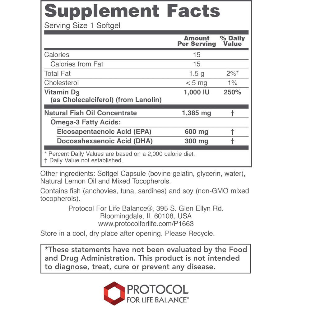 Protocol Ultra Omega 3-D is a premium fish oil supplement that combines high-potency omega-3 fatty acids with Vitamin D3 to support cardiovascular health cognitive function and immune system strength. Each softgel provides a concentrated dose of EPA and DHA essential fatty acids that promote heart and brain health along with Vitamin D3 for enhanced immune support. This supplement is ideal for individuals looking to maintain overall wellness through comprehensive nutritional support. Benefits: Supports Heart Health: Promotes cardiovascular wellness by providing essential omega-3 fatty acids that help maintain healthy cholesterol levels. Enhances Cognitive Function: Contributes to brain health supporting memory focus and overall cognitive performance. Boosts Immune System: Includes Vitamin D3 to strengthen immune function and support bone health. How to Use: Take 1 softgel 1 to 2 times daily with food or as directed by your healthcare practitioner. For best results take with a glass of water. Do not exceed the recommended dosage unless advised by a healthcare professional.