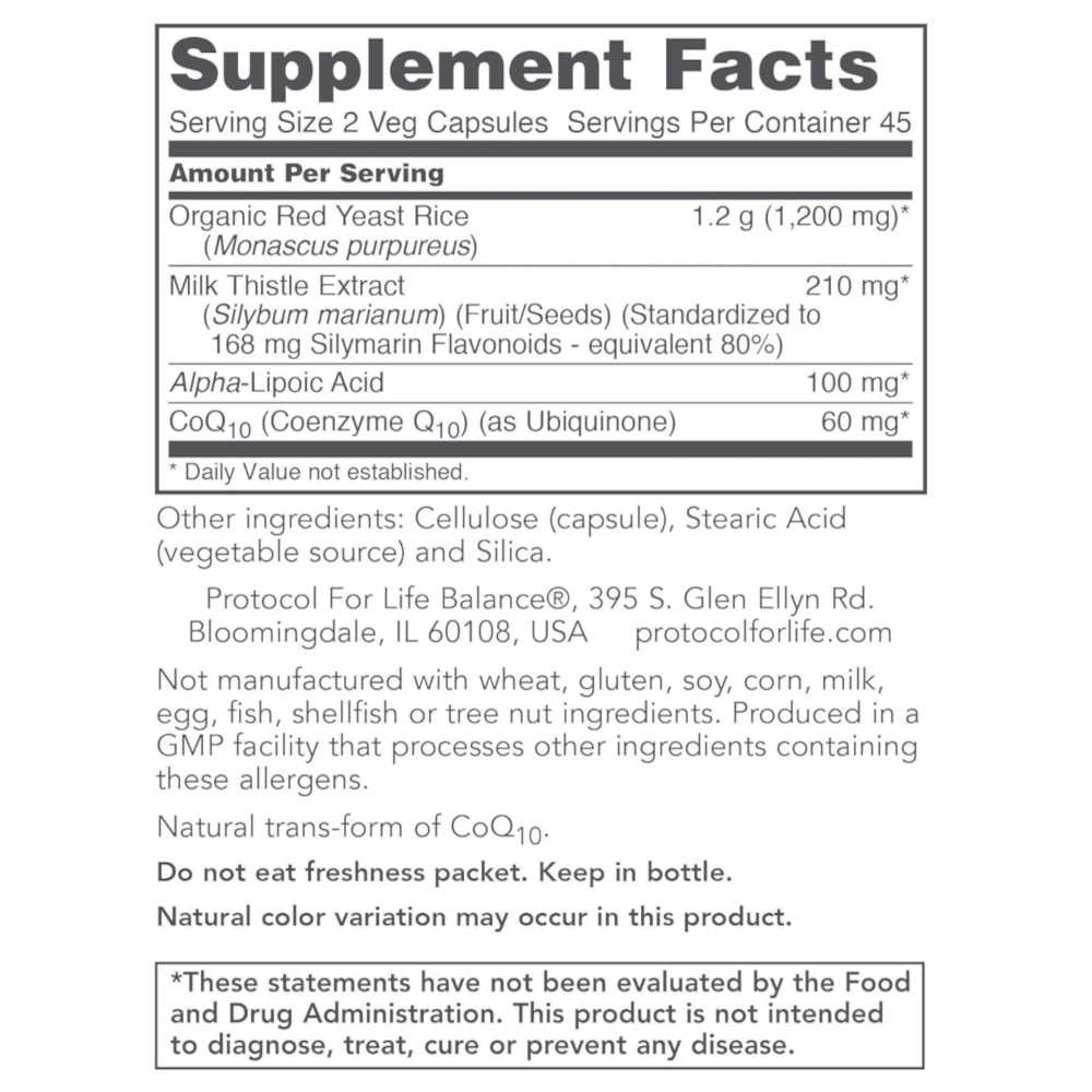 Protocol Red Yeast Rice Extract is a natural supplement designed to support cardiovascular health and maintain healthy cholesterol levels. Red yeast rice is traditionally used in Chinese medicine and is known for its ability to help regulate cholesterol production in the liver. This supplement is ideal for individuals seeking a natural approach to maintaining heart health and balanced cholesterol levels. Benefits: Supports Healthy Cholesterol Levels: Helps maintain balanced cholesterol levels by inhibiting cholesterol production in the liver. Promotes Cardiovascular Health: Supports overall heart health by contributing to healthy lipid profiles. Natural and Effective: Offers a natural alternative for maintaining cholesterol levels without the need for synthetic medications. How to Use: Take 2 capsules 1 to 2 times daily with food or as directed by your healthcare professional. For best results take consistently at the same times each day.