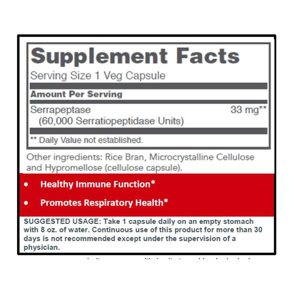 Protocol Serrapeptase 60000 Units of Activity is a powerful enzyme supplement designed to support healthy inflammatory responses promote respiratory health and enhance overall wellness. Serrapeptase is a proteolytic enzyme that helps break down non-living tissue such as mucus and scar tissue supporting the body's natural healing processes. This supplement is ideal for those looking to reduce inflammation improve respiratory function and support overall health. Benefits: Supports Healthy Inflammatory Response: Helps reduce inflammation and supports the bodys natural healing processes. Promotes Respiratory Health: Assists in breaking down mucus and promoting clear airways for better respiratory function. Enhances Healing: Aids in the breakdown of non-living tissue such as scar tissue promoting overall wellness. How to Use: Take 1 capsule daily on an empty stomach or as directed by your healthcare professional. For best results take consistently at the same time each day.