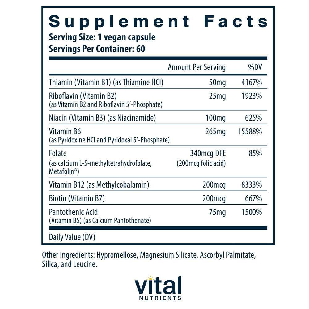 Vital Nutrients B6 + B-Complex is a comprehensive supplement that provides a balanced blend of essential B vitamins including vitamin B6 to support energy metabolism nervous system health and overall well-being. B vitamins are crucial for converting food into energy maintaining healthy brain function and supporting the body's natural stress response. This B-complex formula ensures you get the full spectrum of B vitamins in their optimal forms for maximum effectiveness. Benefits: Energy Metabolism : Supports the conversion of carbohydrates fats and proteins into energy helping to reduce fatigue and boost vitality. Nervous System Health : Promotes healthy nerve function and supports brain health improving mood memory and cognitive performance. Stress Response : Aids in managing the body's response to stress promoting relaxation and mental clarity. How to Use: Take 1 capsule 1 to 2 times daily with food or as directed by your healthcare provider. For best results take consistently at the same time each day. If you are pregnant nursing or taking any medications consult your healthcare professional before use.