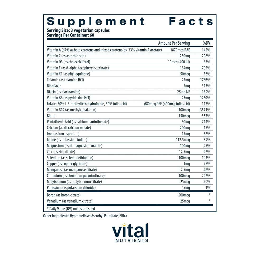 Vital Nutrients PreNatal Multi-Nutrients is a comprehensive prenatal supplement designed to support the nutritional needs of both mother and baby during pregnancy. This formula provides a balanced blend of essential vitamins minerals and nutrients that promote healthy fetal development support maternal health and prepare the body for a healthy pregnancy. It is ideal for women before during and after pregnancy to ensure both mother and baby receive the vital nutrients they need. Benefits: Fetal Development : Provides essential nutrients including folate iron and calcium to support healthy fetal growth and development. Maternal Health : Supports the overall health and well-being of the mother including immune function energy levels and bone health. Balanced Nutrition : Offers a comprehensive blend of vitamins and minerals to ensure optimal nutritional support during pregnancy and lactation. How to Use: Take 3 capsules daily preferably with meals or as directed by your healthcare provider. For best results take consistently throughout pregnancy and breastfeeding. If you are pregnant nursing or taking any medications consult your healthcare professional before use.