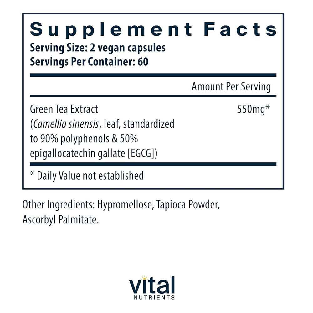 Vital Nutrients Green Tea Extract is a powerful antioxidant supplement that supports cardiovascular health promotes weight management and provides overall cellular protection. Green tea extract is rich in polyphenols particularly EGCG (epigallocatechin gallate) which are known for their potent antioxidant properties. This supplement is ideal for individuals seeking to enhance their heart health support healthy metabolism and protect against oxidative damage. Benefits: Cardiovascular Support : Promotes heart health by supporting healthy cholesterol levels and protecting against oxidative stress. Weight Management : Supports healthy metabolism and fat oxidation aiding in weight management and overall body composition. Antioxidant Defense : Provides powerful antioxidant protection helping to neutralize free radicals and protect cells from damage. How to Use: Take 1 to 2 capsules daily preferably with meals or as directed by your healthcare provider. For best results take consistently at the same time each day. If you are pregnant nursing or taking any medications consult your healthcare professional before use.