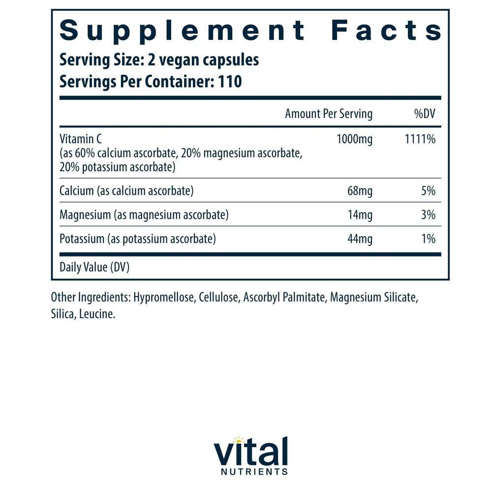 Vital Nutrients Buffered C is a gentle non-acidic vitamin C supplement designed to support immune function promote collagen synthesis and provide antioxidant protection. Buffered with calcium magnesium and potassium ascorbates this formula minimizes stomach discomfort commonly associated with ascorbic acid. It is an ideal choice for those looking for a high-quality vitamin C supplement that is easy on the stomach and highly effective in supporting overall health. Benefits: Immune Support : Boosts immune function helping to defend against colds flu and other illnesses. Collagen Production : Promotes healthy skin joints and connective tissues by supporting the synthesis of collagen. Antioxidant Protection : Provides powerful antioxidant support to protect cells from free radical damage and oxidative stress. How to Use: Take 1 to 2 capsules 1 to 3 times daily preferably with meals or as directed by your healthcare provider. For best results take consistently at the same time each day. If you are pregnant nursing or taking any medications consult your healthcare professional before use.